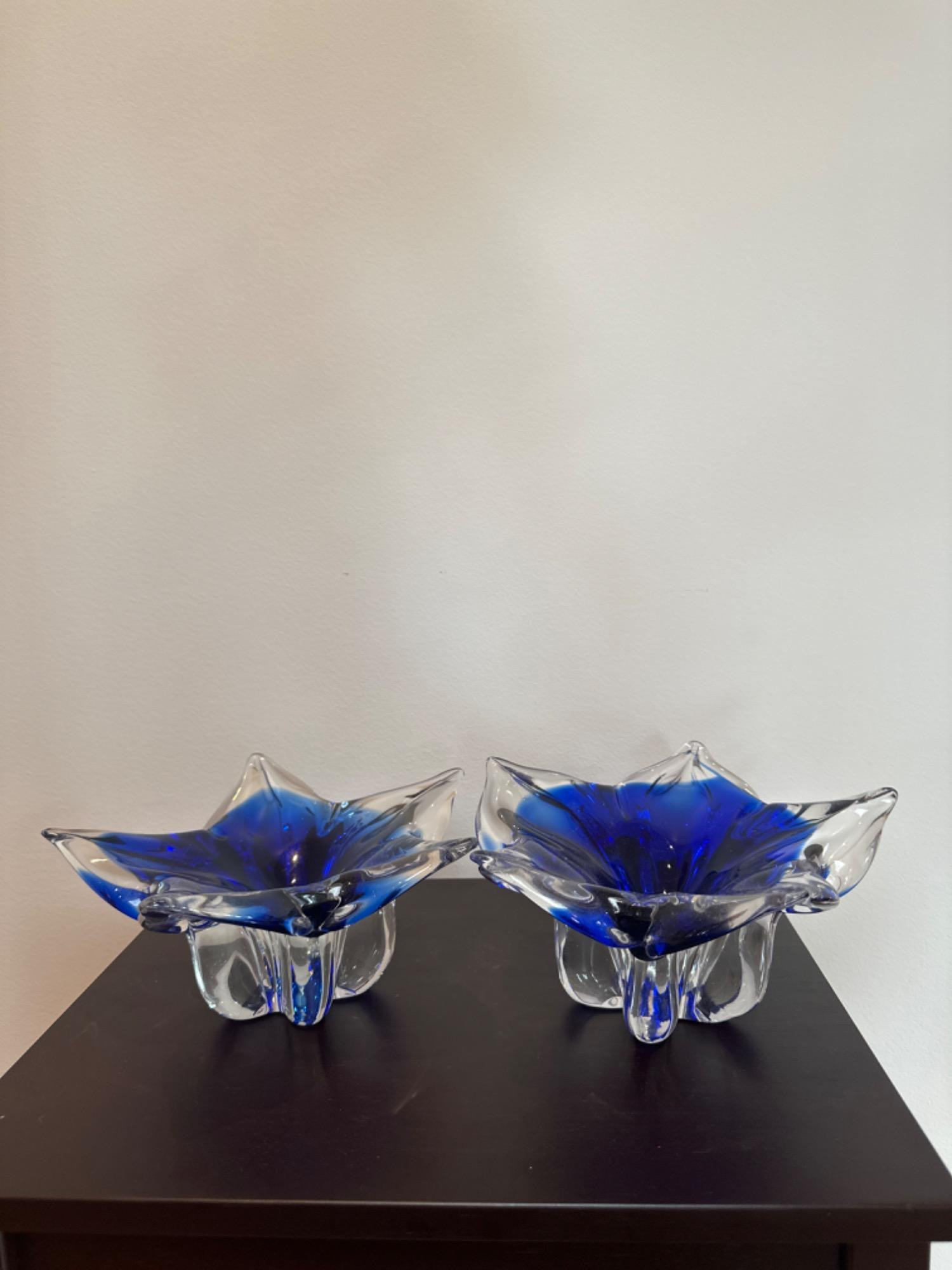 High-quality Murano glass bowls/Votives Flower-like shape with undulating edges Vibrant blue center fading to clear edges Approximately 9 x 4 inches Murano, renowned for glassmaking Striking contrast and organic shape