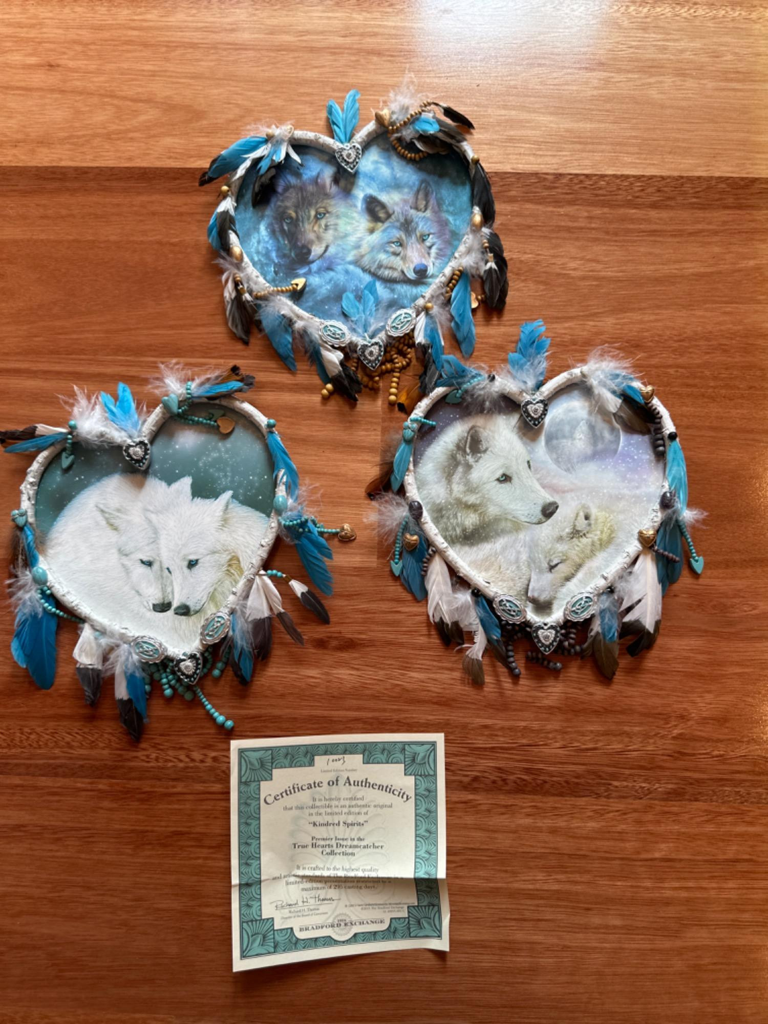 A collection of three wildlife-themed dreamcatchers by Carol Cavalaris. Set of three dreamcatchers: Kindred Spirits, Awakening Dreams, and Dream Guardian Features wolves Adorned with feathers and beads Includes a certificate of authenticity Materials: Fabric Feathers Beads Possibly metal ornaments