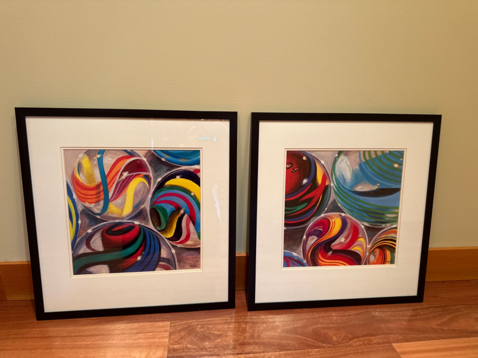 Two framed artworks depicting colorful marbles. Detailed and vibrant marble designs High level of detail and three-dimensional appearance Materials: Likely canvas or paper Framed with glass Approximately 23.5 W x 24.5 T