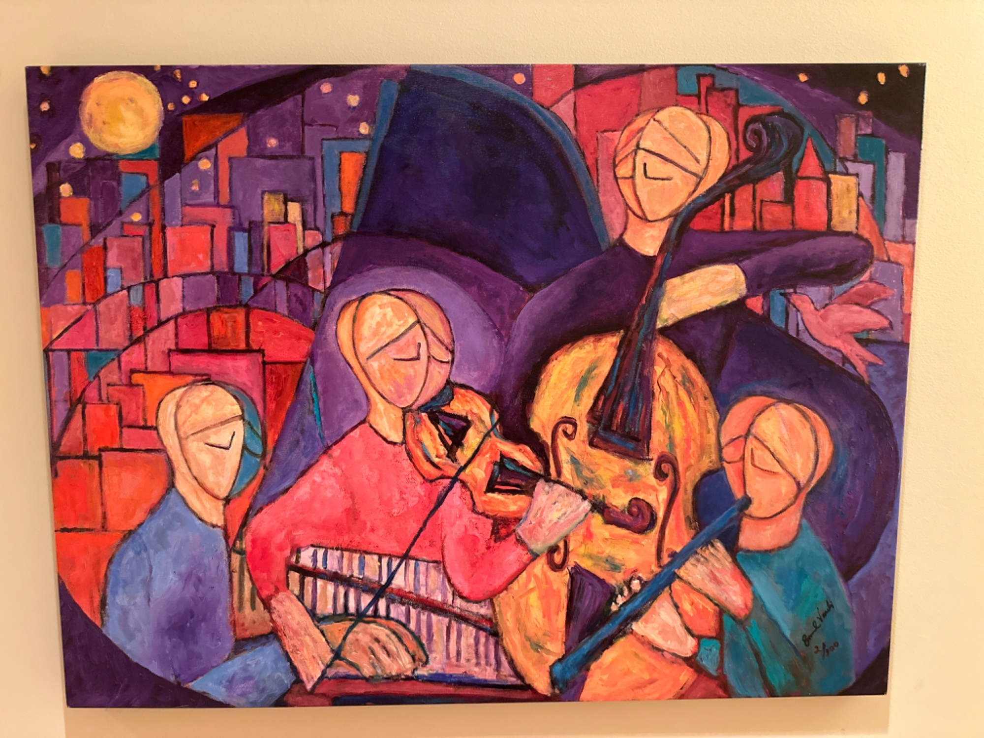 An abstract painting of musicians. Vibrant use of color. Theme of music and harmony. Abstract representation of figures and setting. Presumably acrylic or oil paint on canvas. Signed by artist.