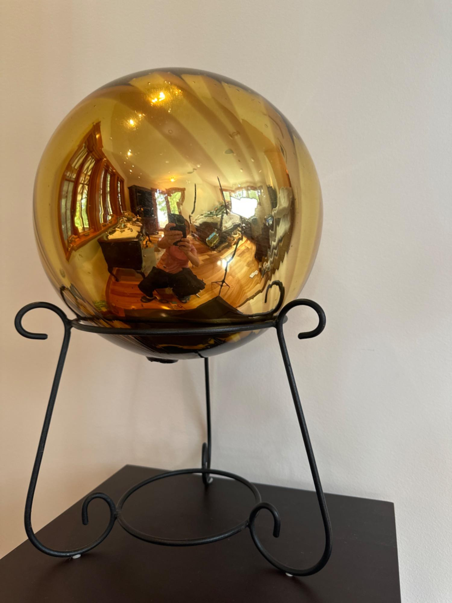 A decorative metallic glass orb with a gradient finish, displayed on a metal stand. Approximately 10 x 10 inches. Reflective surface with a gradient color transition. Ornamental piece with unique visual effects.