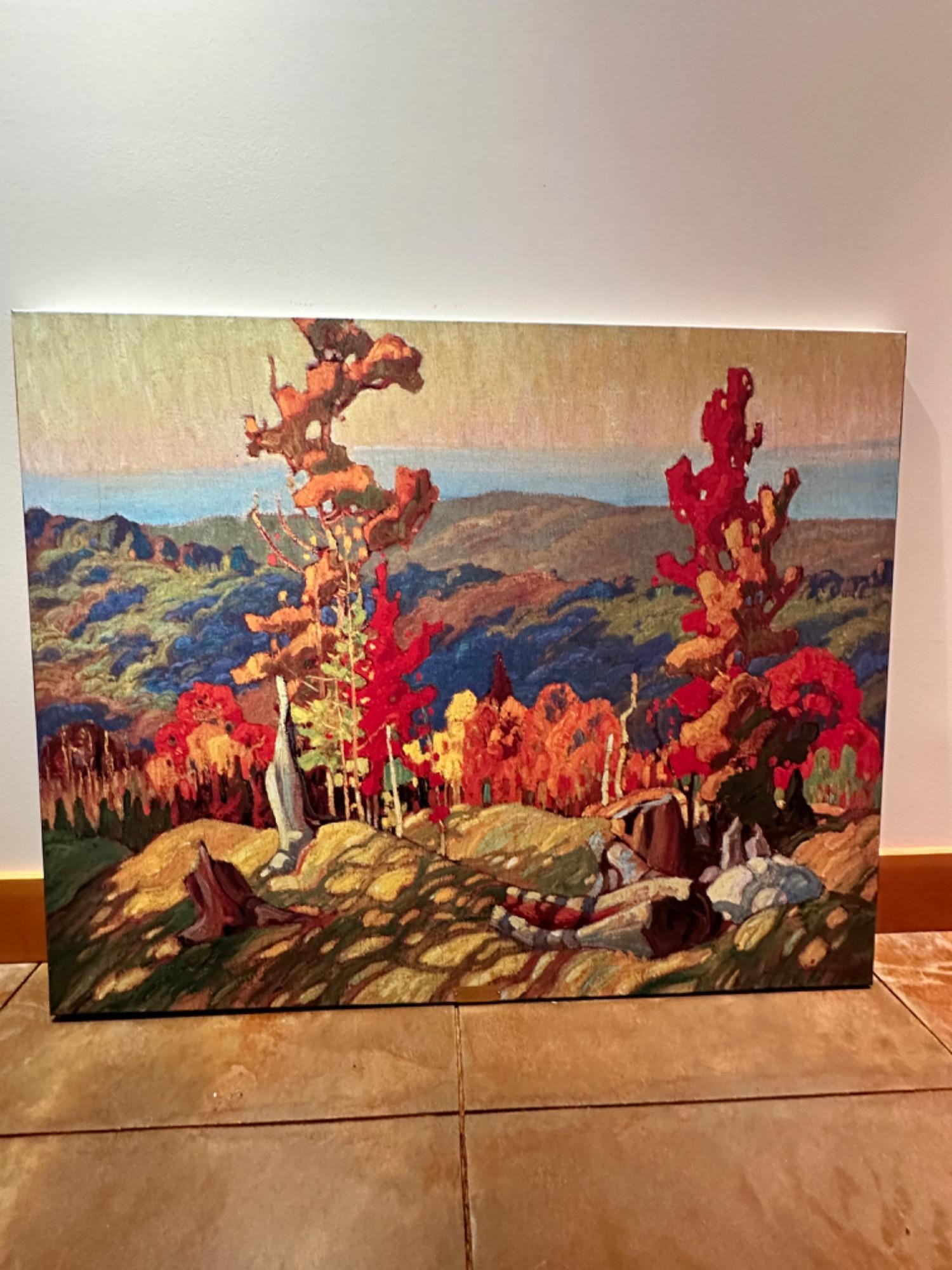 A print on canvas of the painting “Northland” by Carmichael. Vibrant landscape print Autumnal colors Bold brushstrokes Dynamic and textured appearance Canvas