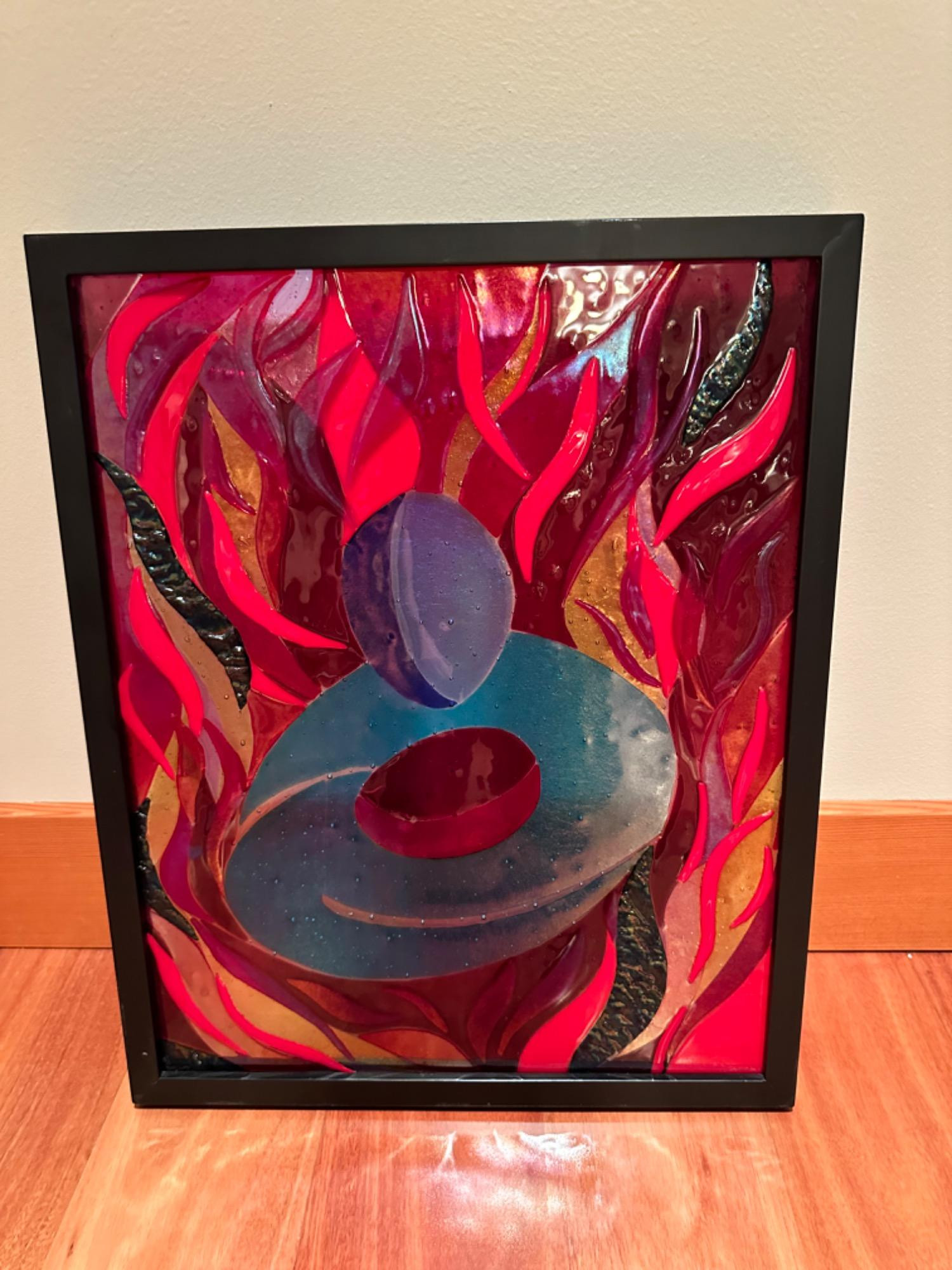 An abstract stained glass artwork . Abstract design with a prominent blue and purple element resembling a flame or leaf. Red bowl or vessel at the bottom. Swirling and curving forms in shades of red, pink, and hints of silver or grey. Vibrant colors and dynamic composition. Varied textures that interact uniquely with light. Colored glass pieces, likely held together by lead came or copper foil. Approximately measuring 21 x 17 inches.
