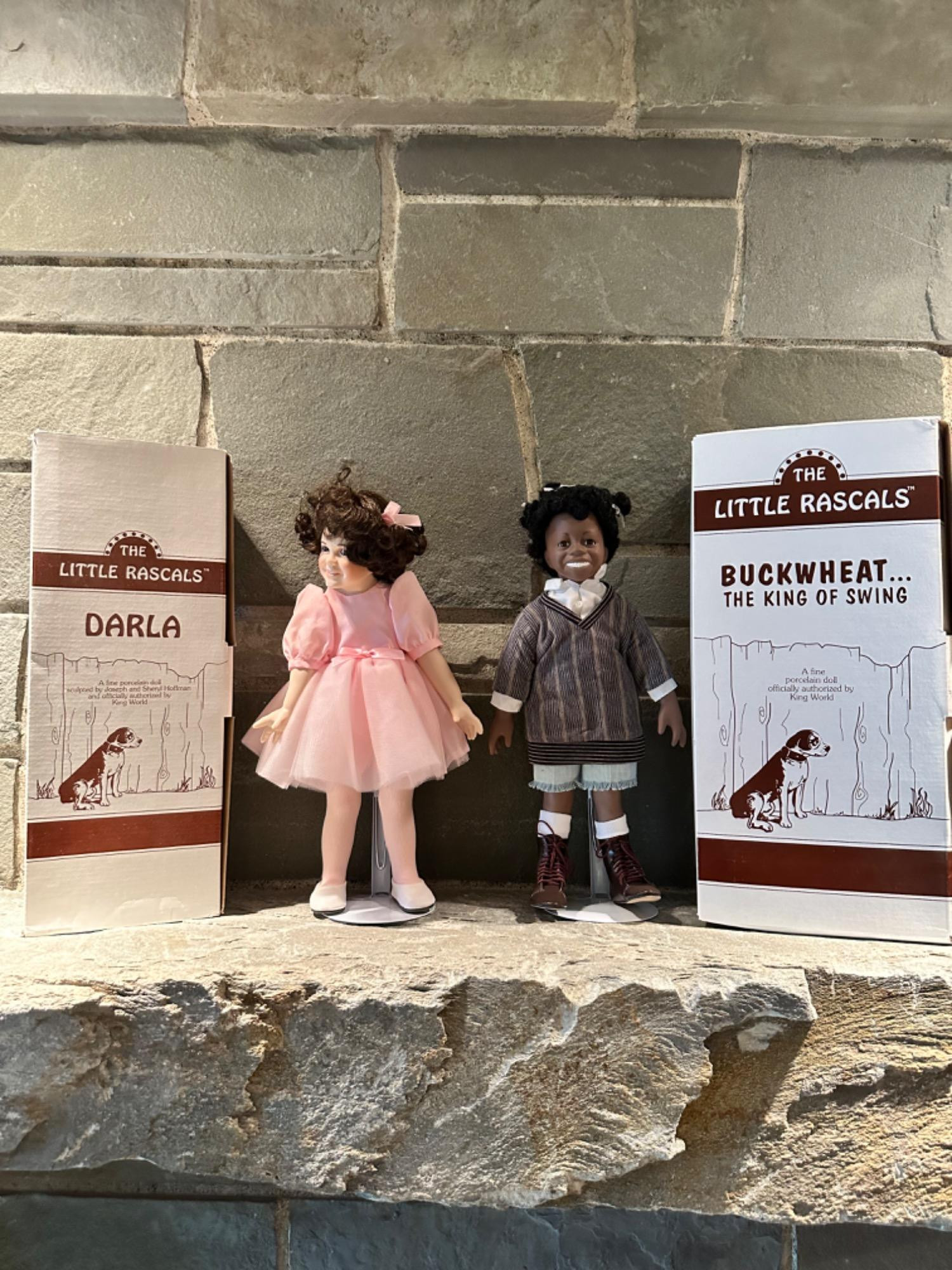 Two fine porcelain dolls representing Darla and Buckwheat from “Little Rascals,” sculpted by Joseph and Sheryl Hoffman, officially authorized by King World. Fine craftsmanship of porcelain material Officially authorized collectible Iconic characters from “Little Rascals”