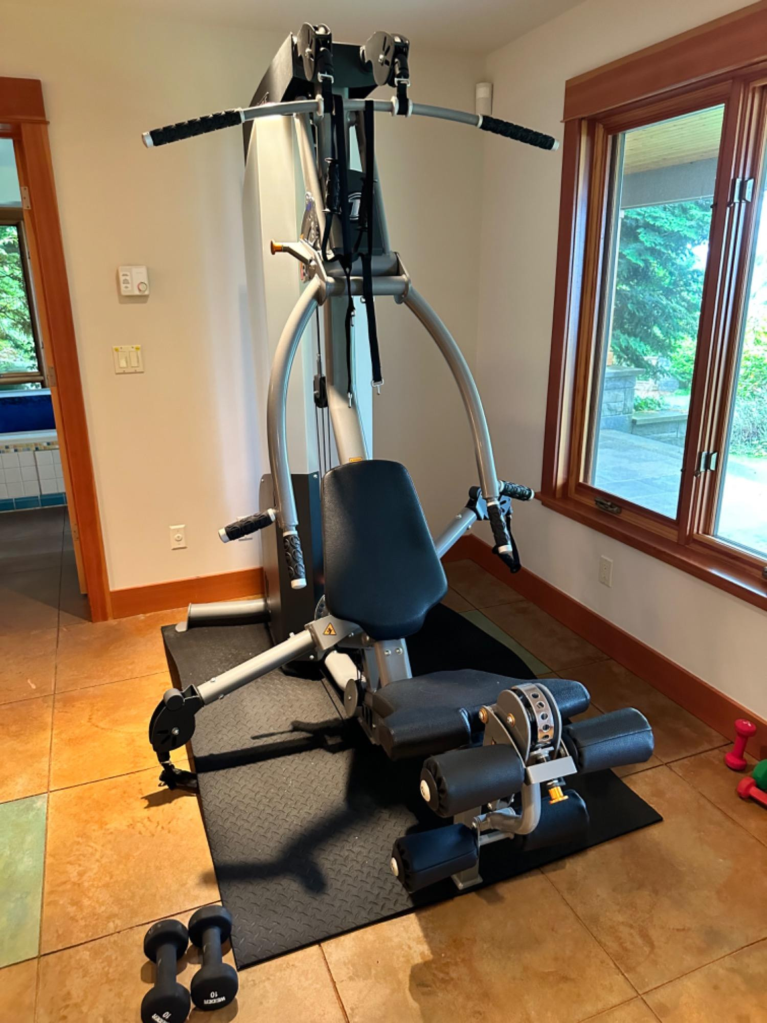 A multi-station home gym system designed for various strength training exercises. Includes multiple workout stations: high pulley, low pulley, leg developer, adjustable press arm. Ideal for comprehensive strength training at home. Durable and versatile fitness equipment. Steel frame with padded seats and backrests, likely made of vinyl or leather CLICK HERE TO LEARN MORE ABOUT THIS PRODUCT