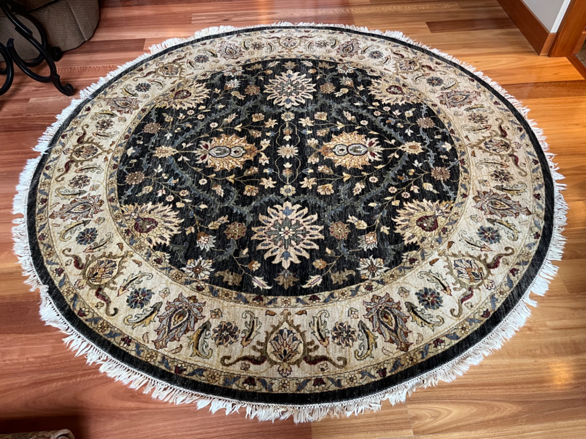 A large round Persian wool rug. Hand-knotted craftsmanship. Intricate floral and foliate motifs with a central medallion. Traditional design with a rich color palette. Wool made.