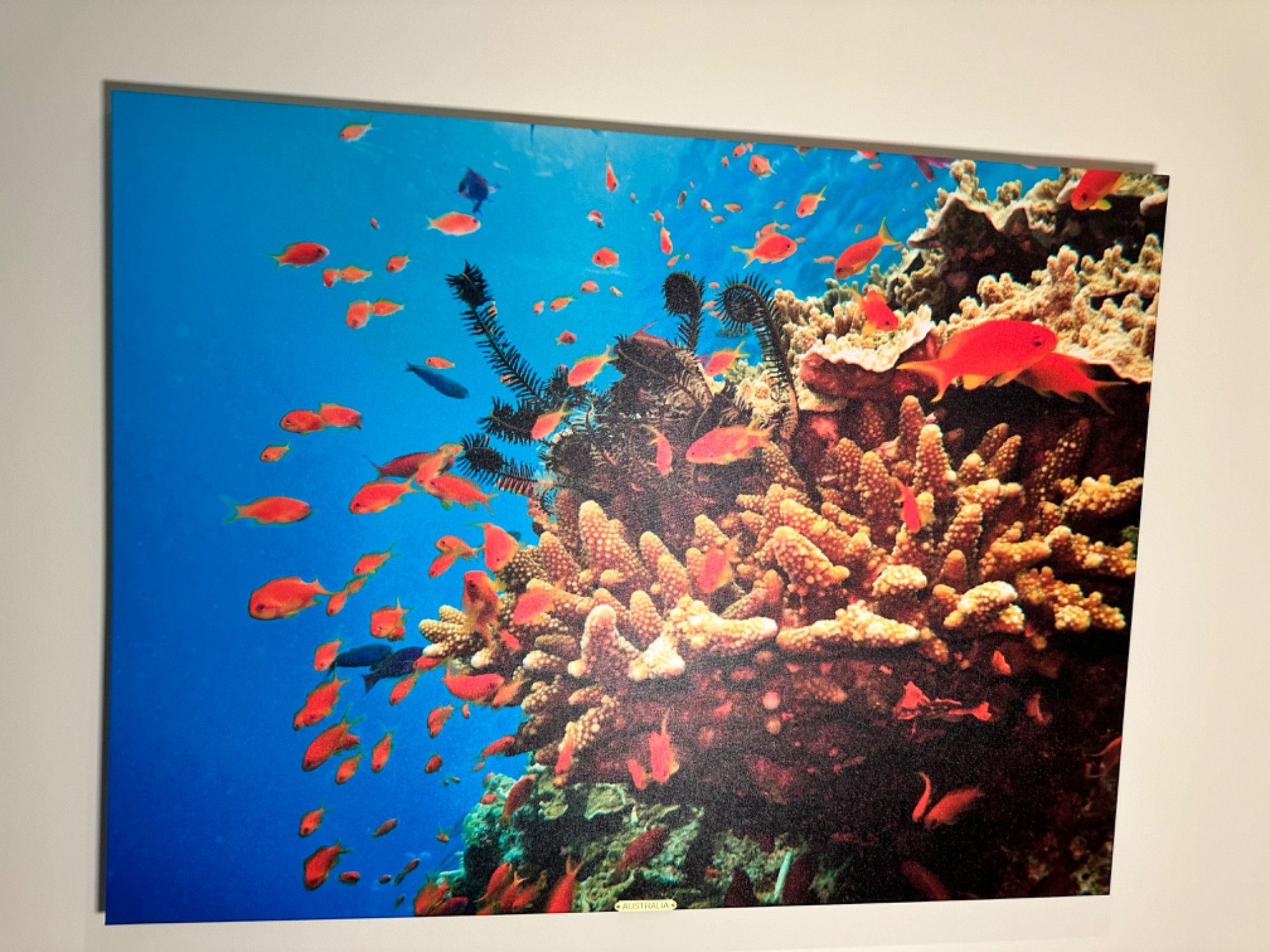 This is a large canvas print of an underwater photograph featuring a coral reef scene. Sizable statement piece for interior decoration. Depicts rich marine biodiversity. Striking use of color. Canvas material stretched over a frame, likely printed with high-quality ink. Approximately 48 x 36.