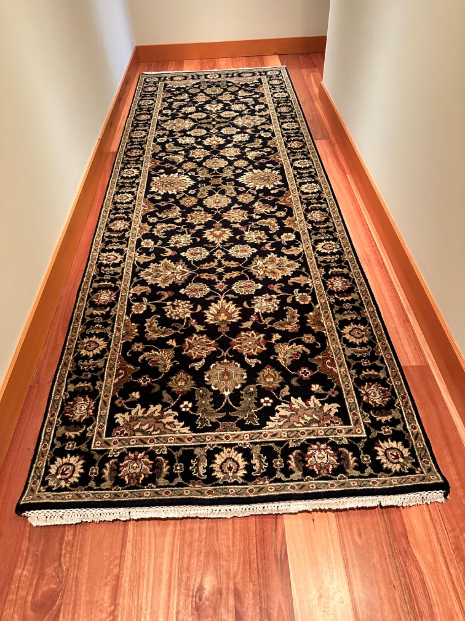 Hand-knotted wool rug from Pakistan in the Tabriz style. Traditional design Intricate floral and geometric patterns Hand-knotted craftsmanship Predominantly black with gold, beige, and white accents Wool made.