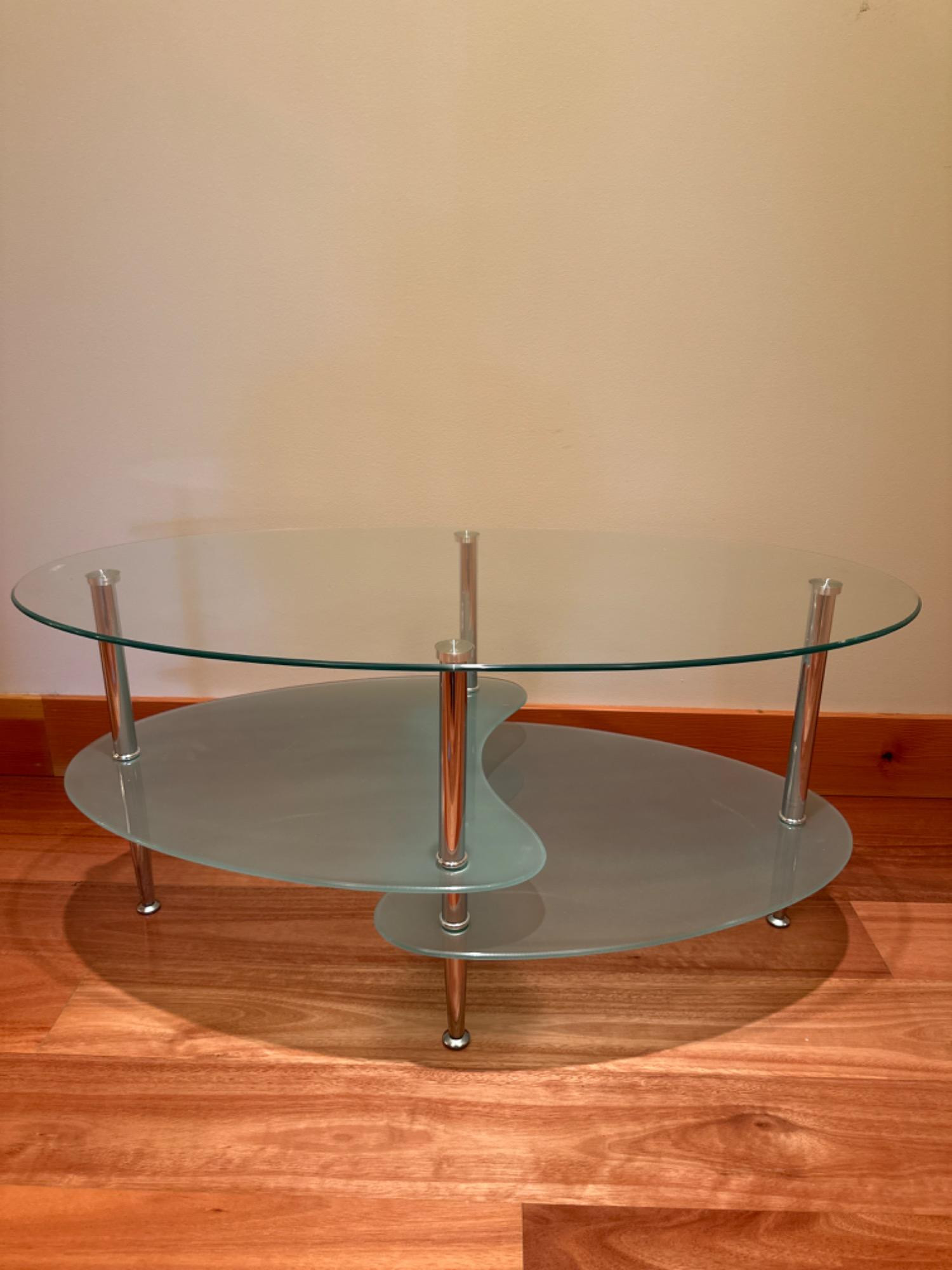 A two-tiered coffee table from the 1990s with an oval-shaped design. 1990s Retro, oval-shaped, two-tiered Tempered glass surfaces, chrome-finished metal supports This table combines vintage aesthetics with durable materials, making it a stylish and functional piece for any living space.