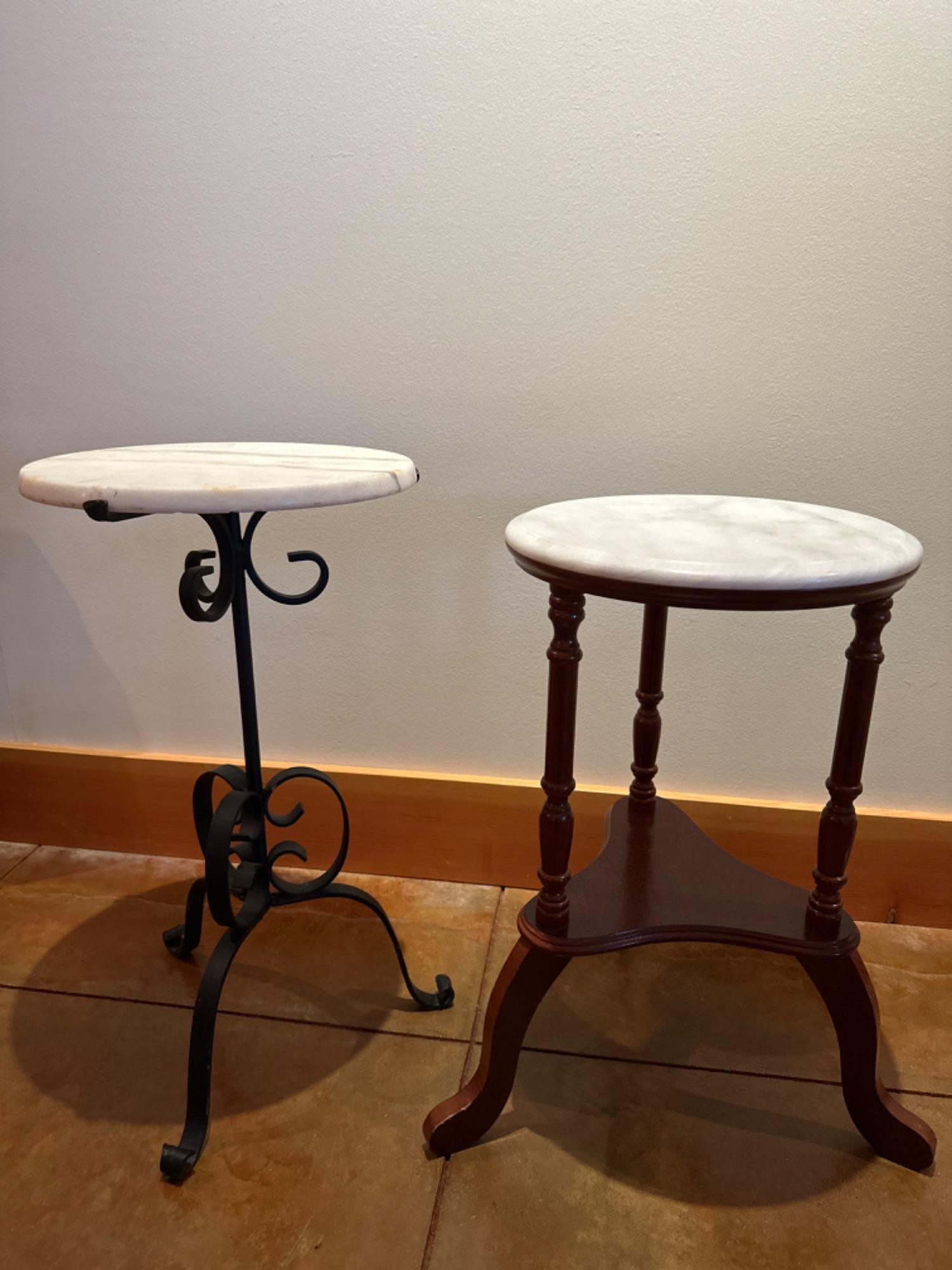 Marble top table with an ornate wrought iron base. Marble top table with a wooden base and lower shelf. Natural white marble with gray veining for the tabletops. Decorative metalwork on the left table, additional shelving on the right table.
