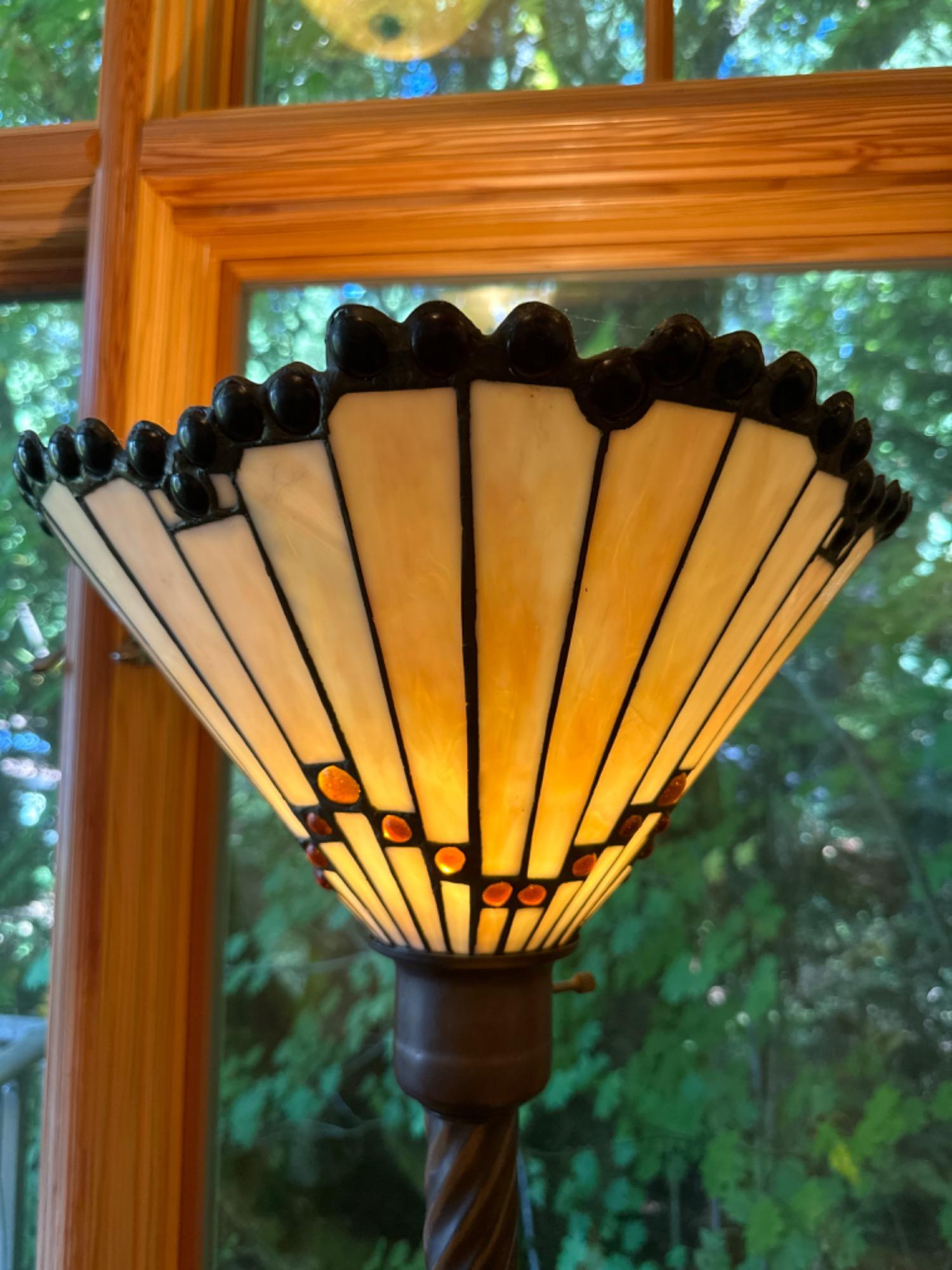 A stained-glass floor lamp, approximately 70 inches tall. White and translucent glass panels with dark-colored bead accents Vintage or antique, possibly inspired by Art Nouveau or Art Deco Approximately 70 inches Stained glass with lead came Dark-colored glass bead accents