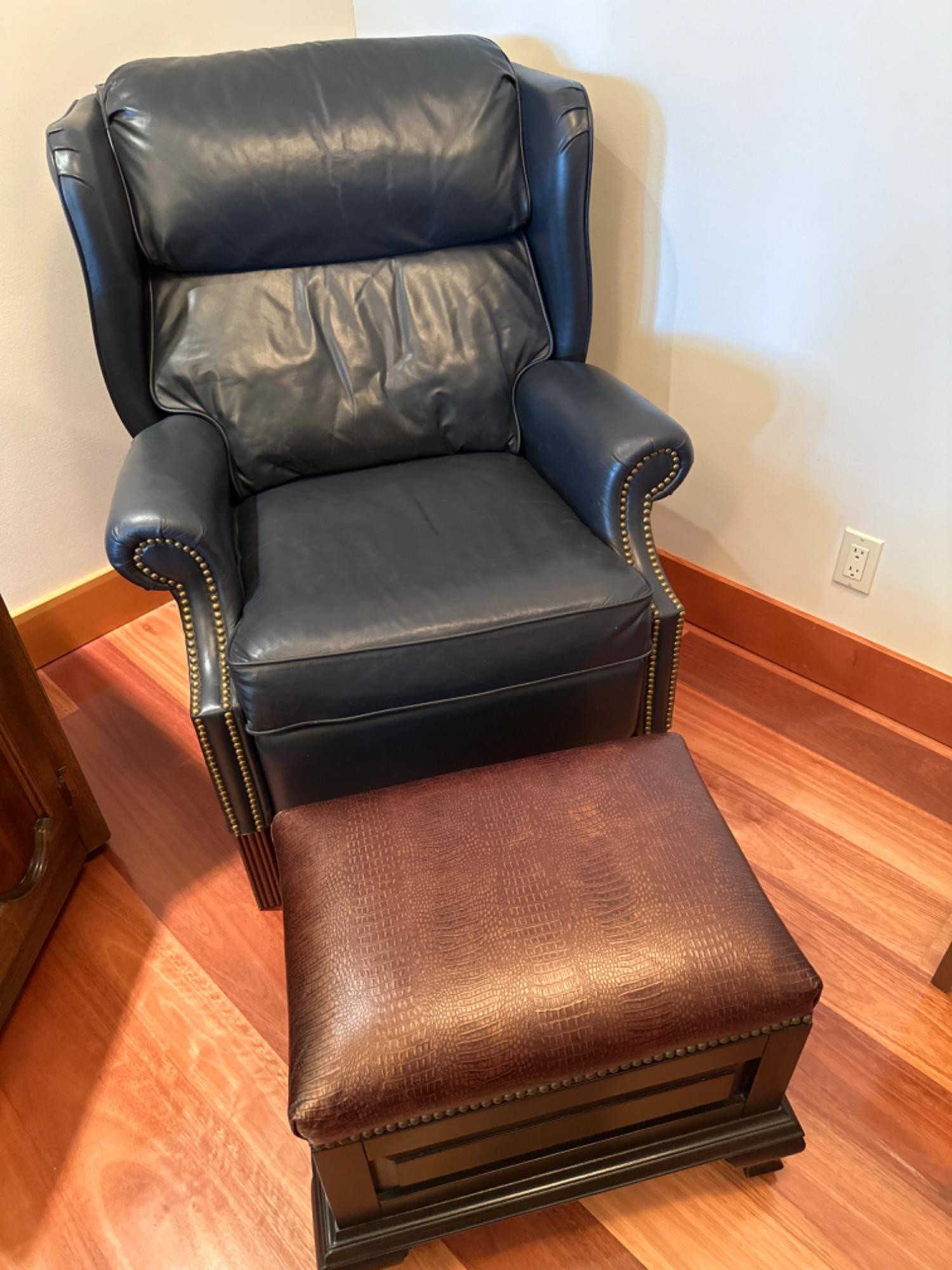La-Z-Boy recliner chair with matching ottoman High back and plush cushioning for comfort Classic rolled arms with nail head trim Dark green leather upholstery Matching ottoman with cushioned top and a sturdy wooden base frame La-Z-Boy is renowned for its durable and comfortable furniture, with a history of innovation in recliner design since 1927. La Z Boy Classics Leather chair- 36 H x 32 W x 35 D Nail head trim. Fine leather grain. Ottoman-16.5 H x 20 W x 14.5 D (ottoman is not a La Z Boy Product) Brown leather grain top and solid wood base.