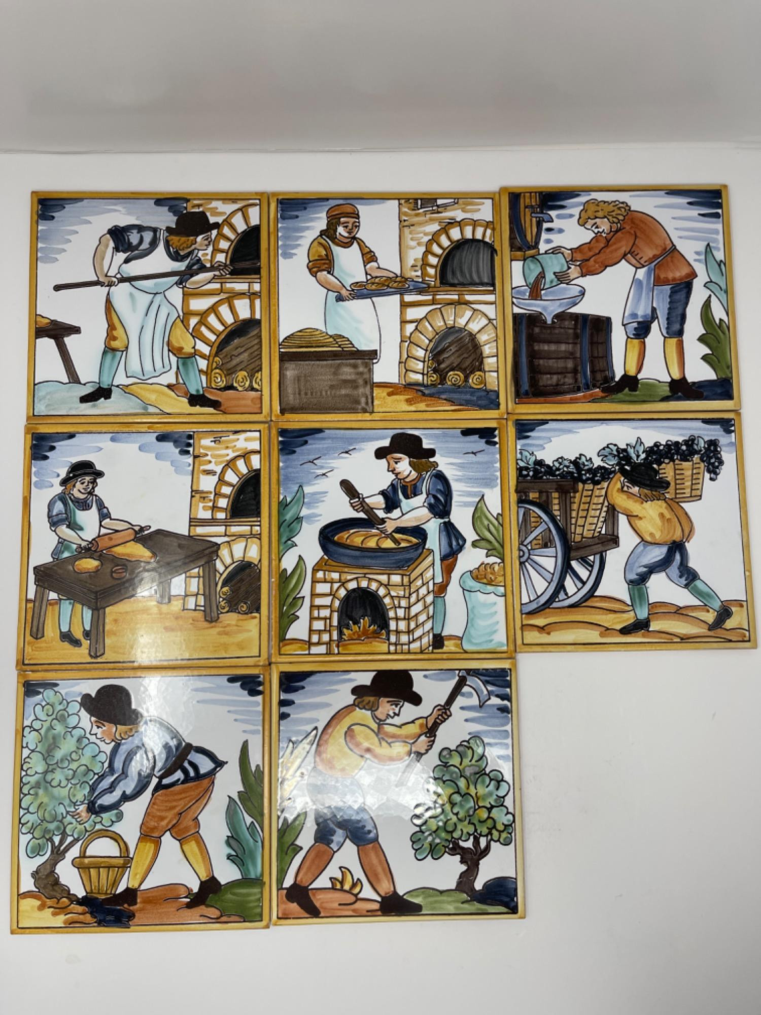 Set of nine hand-painted ceramic tiles from Spain Each tile features a unique scene Depicts traditional baking and vine harvesting activities Detailed and colorful artwork Ceramic with hand-painted illustrations Reflects Spanish cultural heritage Showcases everyday life and labor in past centuries Represents traditional Spanish craftsmanship