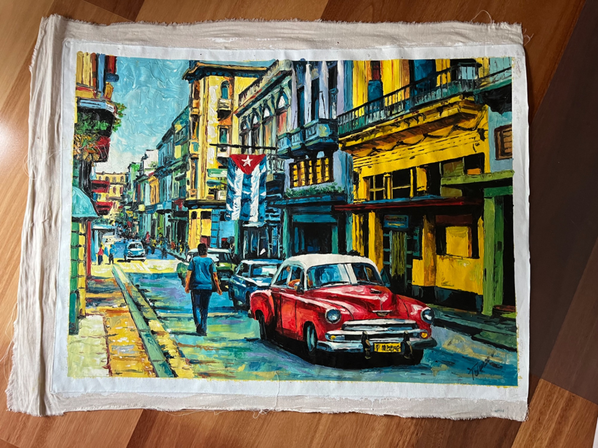 Original oil painting depicting a lively Cuban street scene Bold colors and dynamic brushstrokes Features urban architecture, a classic red car, and pedestrians Reflects the essence of Cuban culture and daily life Oil paints on canvas Original artwork by a Cuban artist, potentially valuable for its authenticity and artistic quality