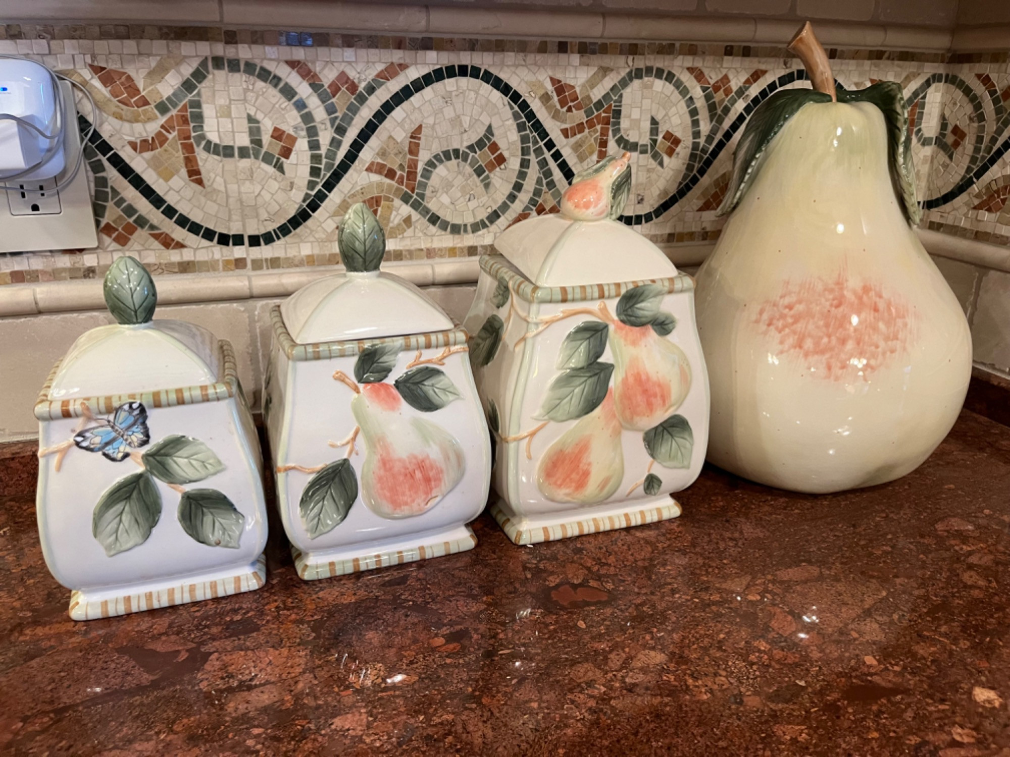 Set of three ceramic canisters with pear design One decorative ceramic pear Thematic pear design across all pieces Soft color palette with white, green, and pink accents Decorative and functional kitchenware Glazed ceramic Fitz & Floyd: Known for whimsical yet elegant ceramics since 1960 Fruit motifs, like pears, are popular in their collections