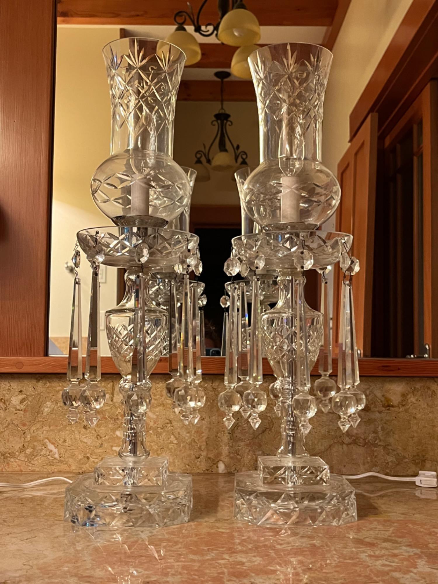 Candlestick Form Hurricane Shades, Pendant Crystals Luster Style. Pair of ornate hurricane lamps Intricate etched glass design Multiple hanging crystal prisms Reflective surfaces for decorative appeal Clear cut glass Faceted crystals Style reminiscent of 19th-century lighting design Indicative of skilled craftsmanship, potentially antique or vintage-inspired