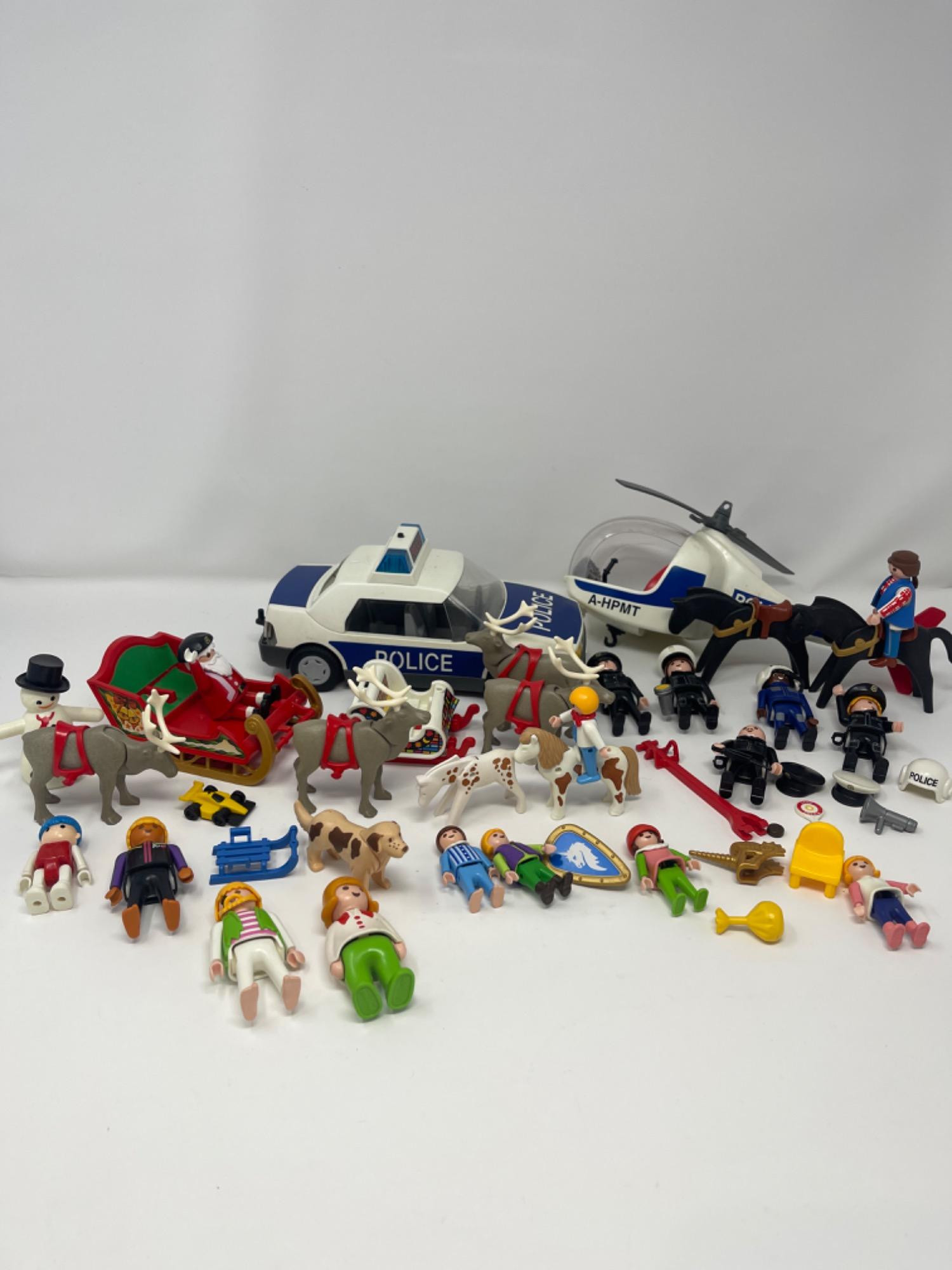 Vintage Playmobil Goebra Toys All pieces need cleaning. May be missing parts, but all parts included are photographed in detail. Tallest: 4.5” H