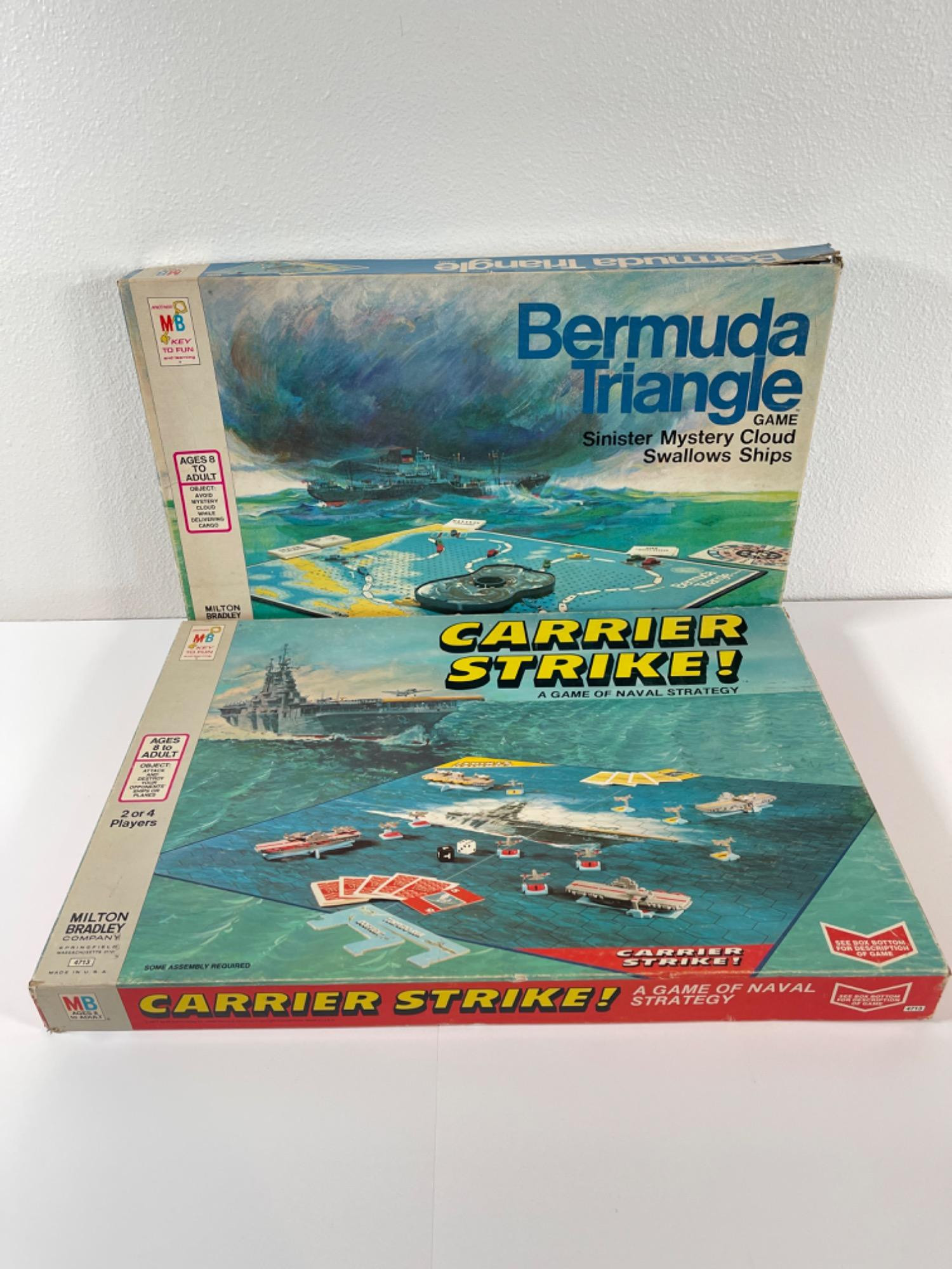 Vintage 1970s Bermuda Triangle & Carrier Strike Games UNKNOWN COMPLETENESS, but all contents are photographed in detail. Boxes are NOT in very good condition. Multiple rips and tears to both.