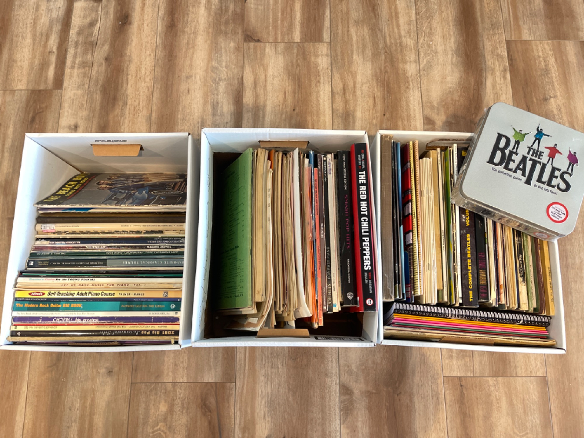 Boxes of Vintage Used Music Books & Pieces Beatles box is sealed and unopened. Not all included pieces are photographed in detail. So much more to find! All have some tearing and staining from use.