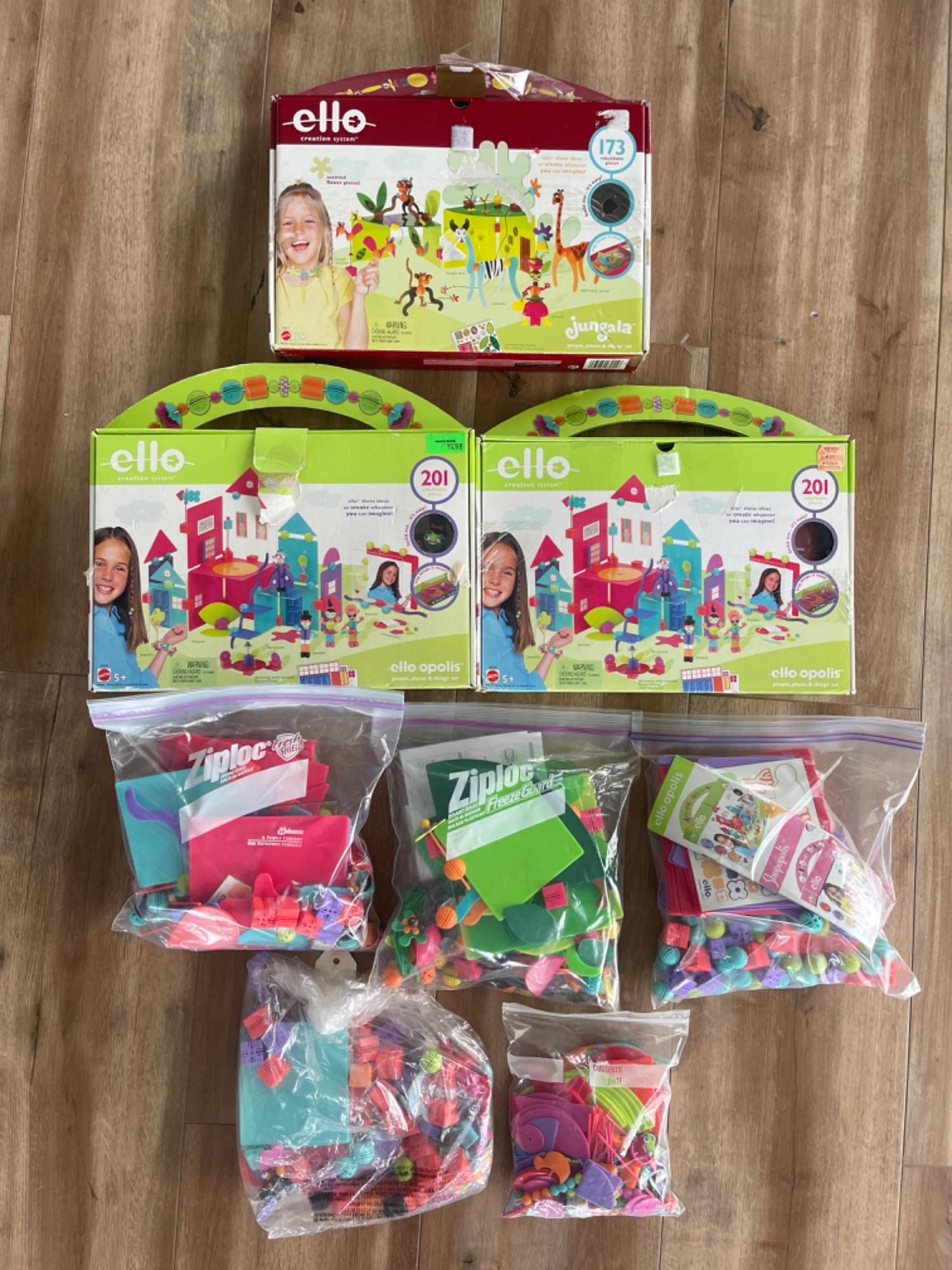 Opened Vintage Ello Creation Systems UNKNOWN COMPLETENESS. ALL ARE USED AND OPENED. All pieces included are photographed, but not all bags explored.