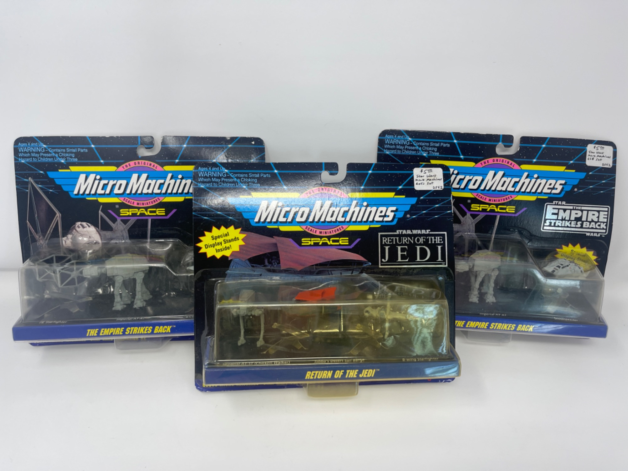 Micro Machines Space "The Empire Strikes Back" & "Return Of The Jedi" Never opened and seal holding well. "Return of the Jedi" has some yellowing to packaging. All have some dents and damge to packaging, but are in generally good condition.