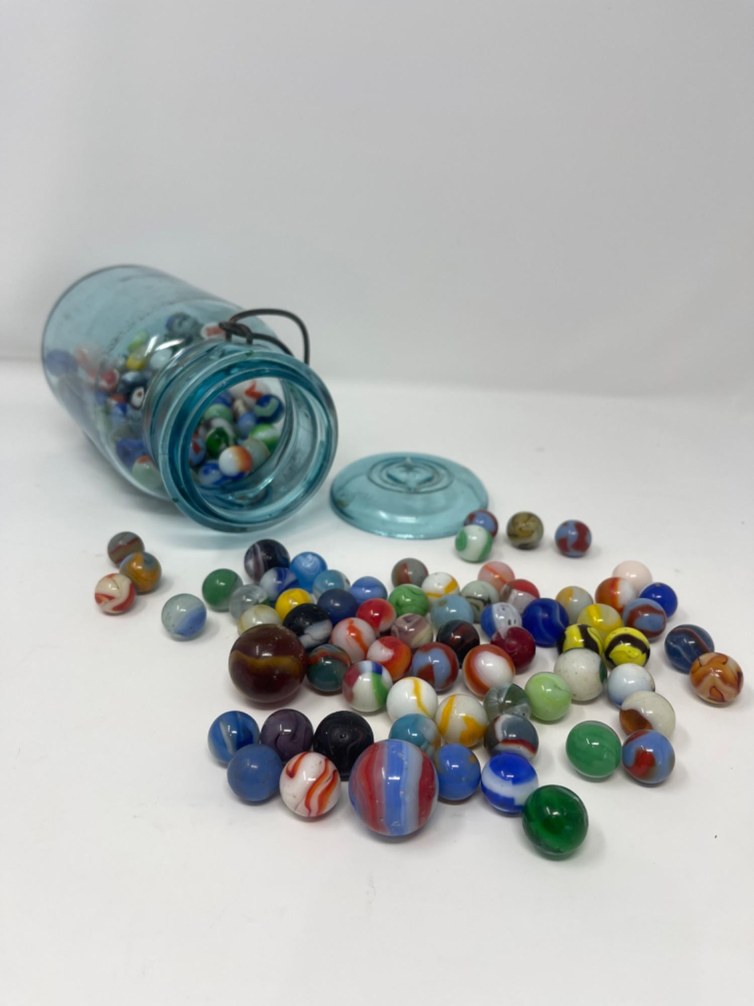 Jar of Vintage Marbles! Most of the marbles have chips and scratches Largest: 1” in diameter Jar: 7.5" H