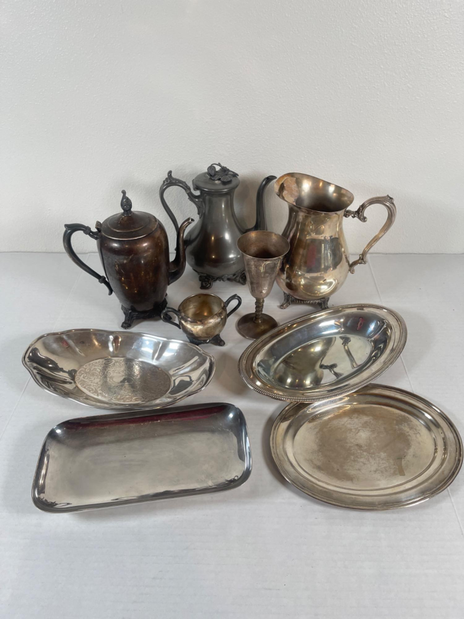 Vintage Silver Plated Dishes, Pitchers and More! All have tarnishing and staining. Tallest: 9" Widest: 12.25”