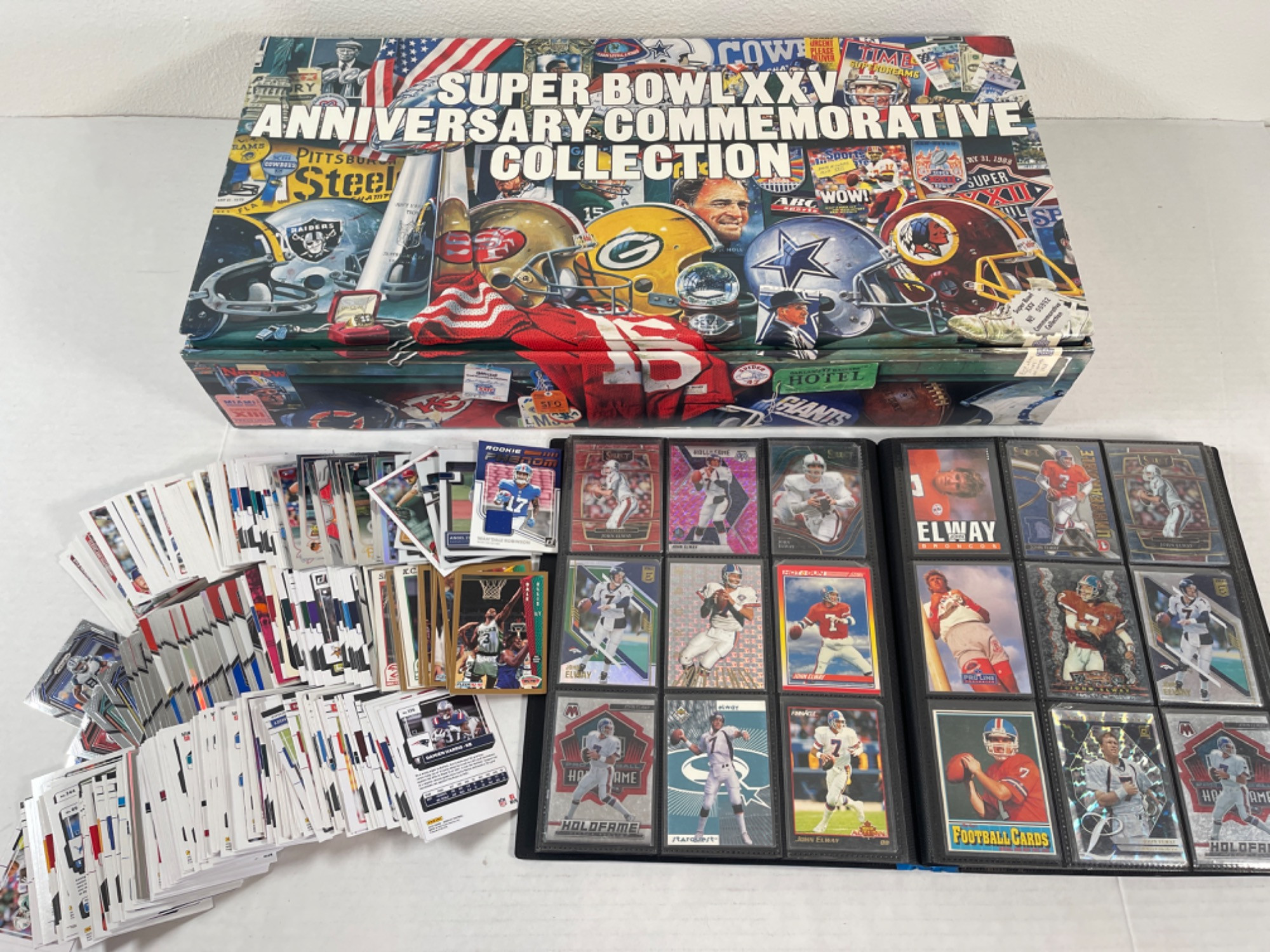 Super Bowl XXV Anniversary Commemorative Collection & Cards! Binder is about 90% full. Unknown completeness of Super Bowl piece. Not all included cards are photographed in detail. More to find!