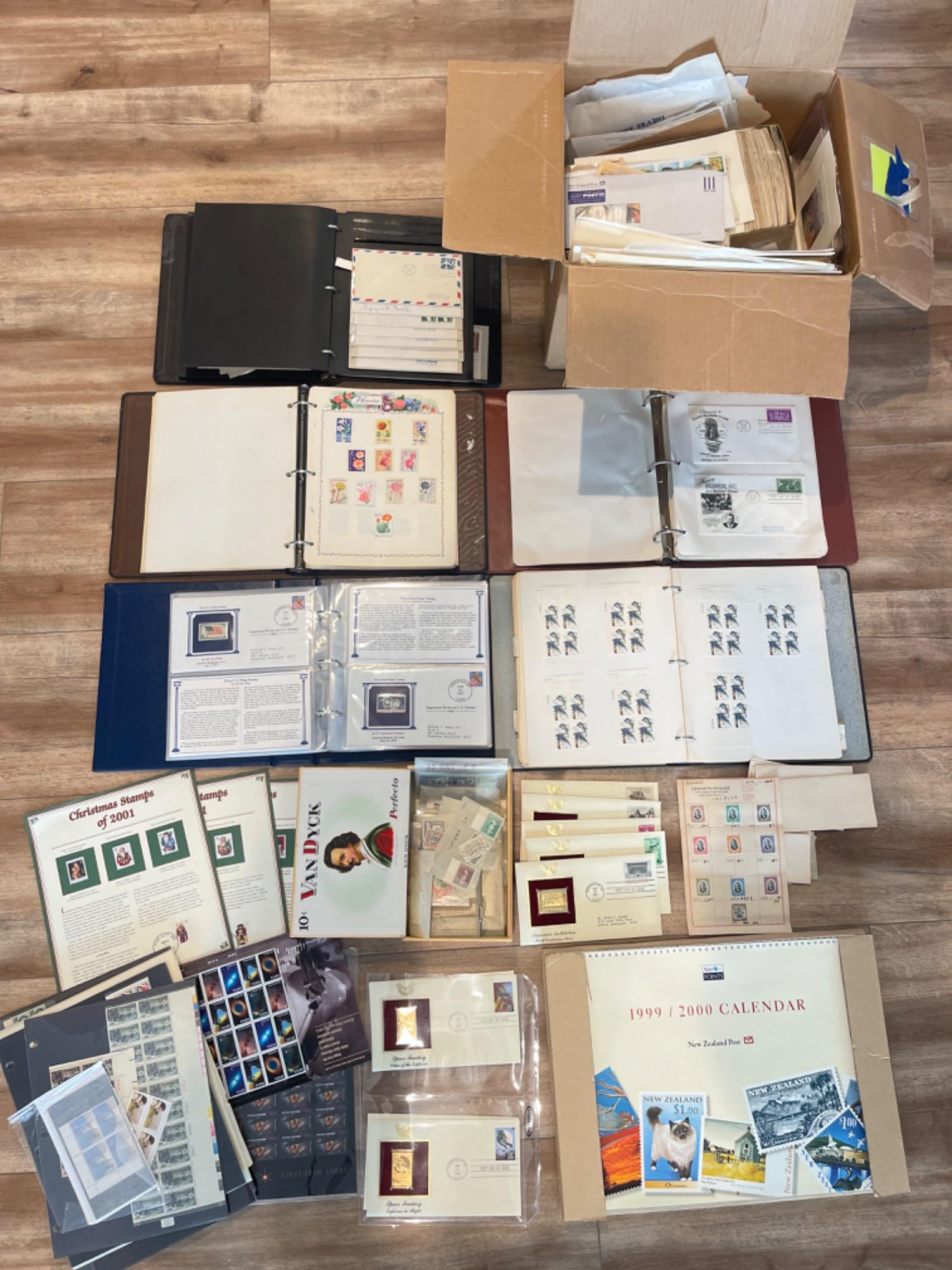 Large Collection of Vintage Stamps, Letters and More! Not all contents explored. More to find! All binders are about 90% full. Box dimensions: 16" L x 12.75" W X 10" H and is 90% full