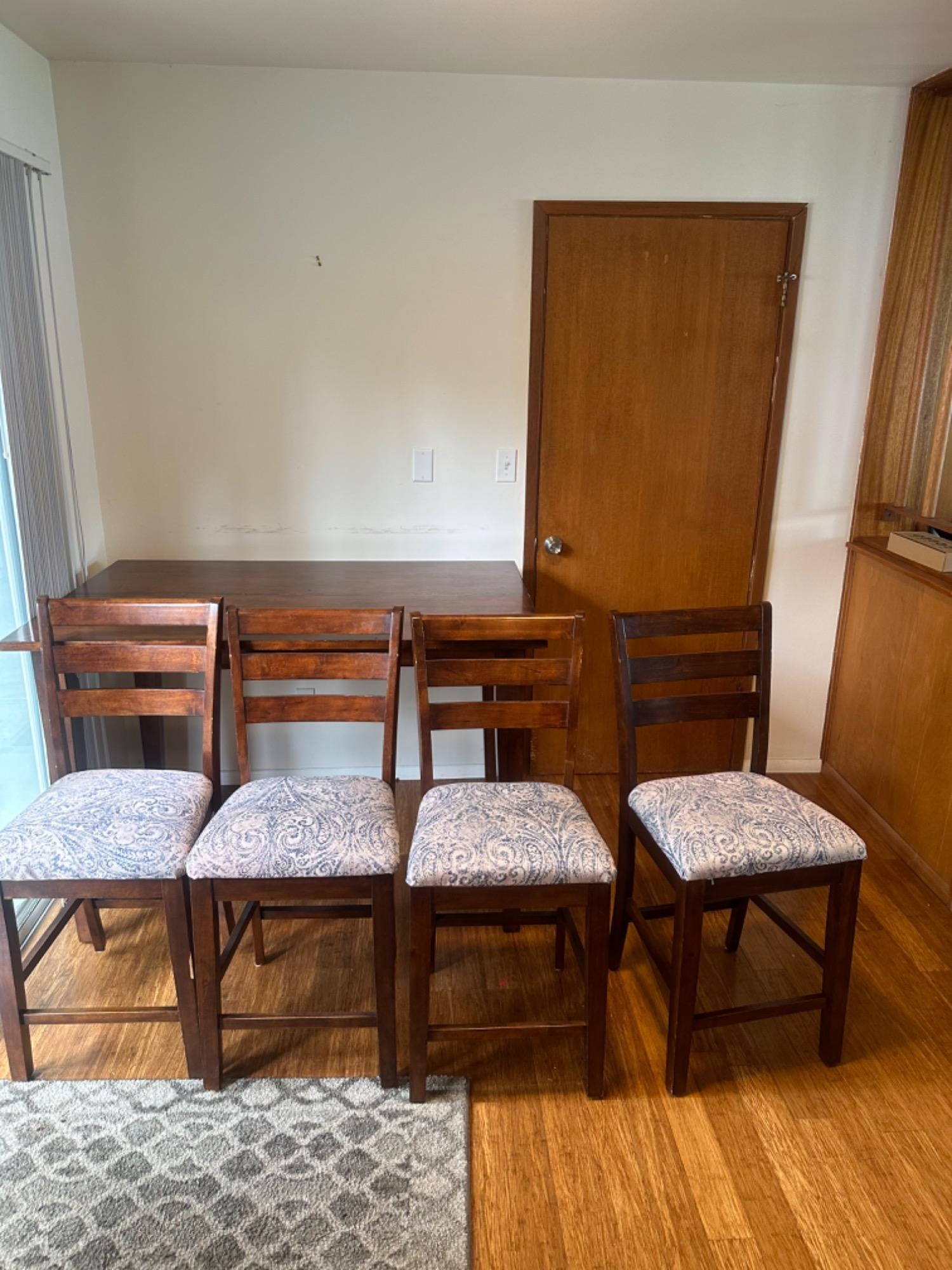 Dining Table with 8 Chairs 1 leaf (self-stores on underside of table) *Dimensions listed are with the leaf in Chair dimensions: 17 3/4”W x 17”Deep x 40”H fabric seats