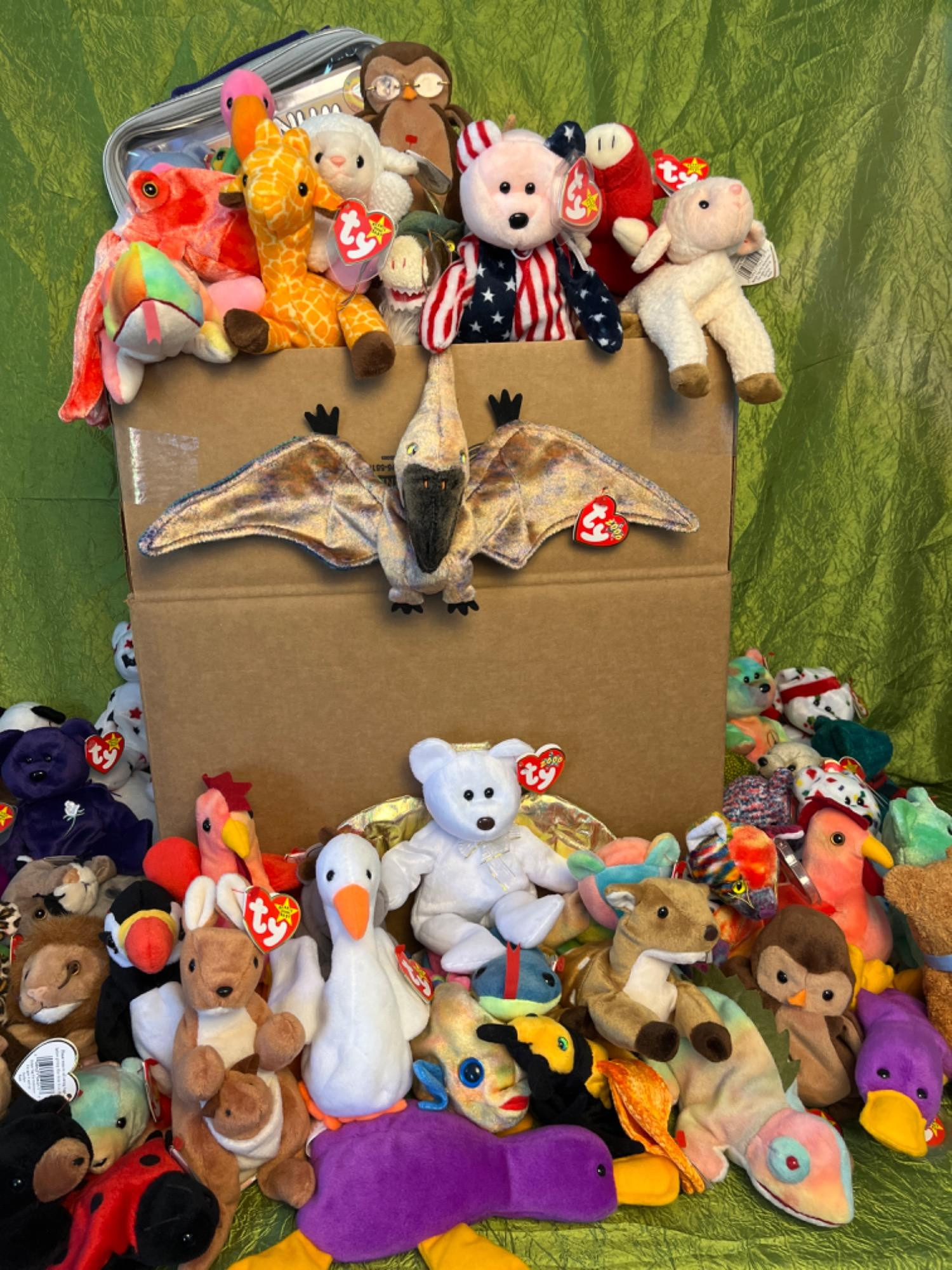 Many RARE - Misprint Collectible Beanie Baby Lg. Lot #2 A gigantic collection of Beanie Babies that includes many hard-to-find Beanies and misprint tags You’ll find minis in this lot also! This collector focused her attention on the RARE Pics are just a sample of what is in this lot Non-smoker, non-pet house Box shown in photo measure 16”L x 12”W x 18 1/2”H