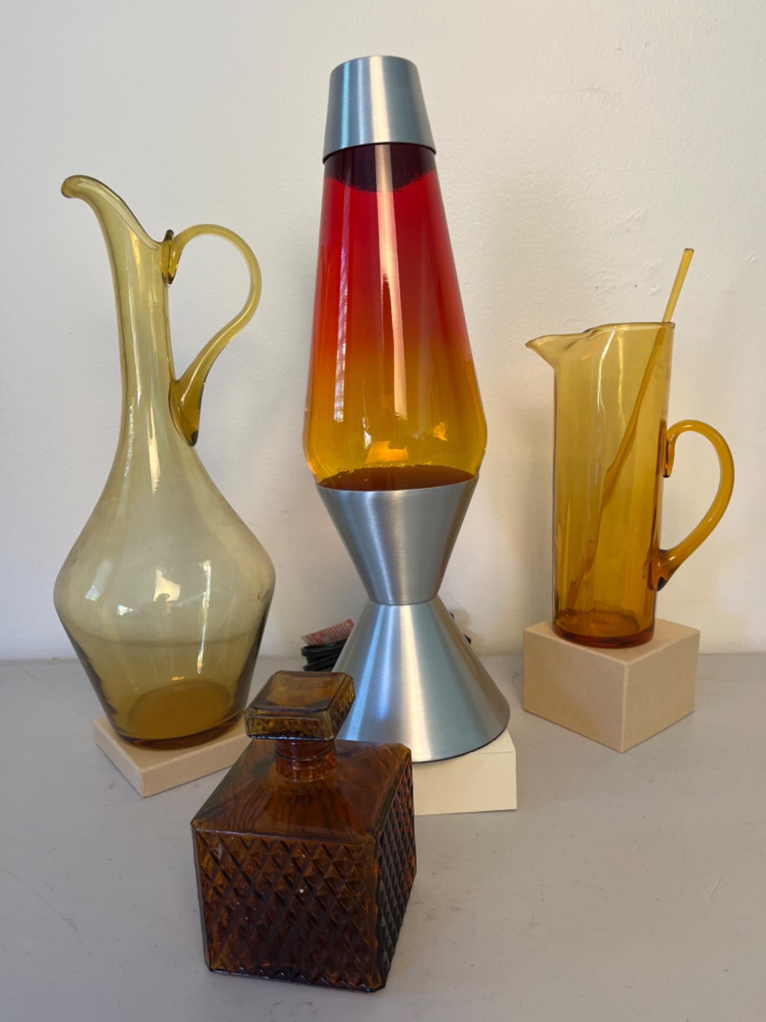 Lava Lamp & Amber Glass Groove Lava Lamp (works) - Dia: 5” x 16” decanter - 3 1/2” x 3 1/2” x 5 1/4” Vtg. Ling neck pitcher/vase: Dia: 6” x 15 1/4”H Vtg. Pitcher/stirrer: Dia: 3” x 9”