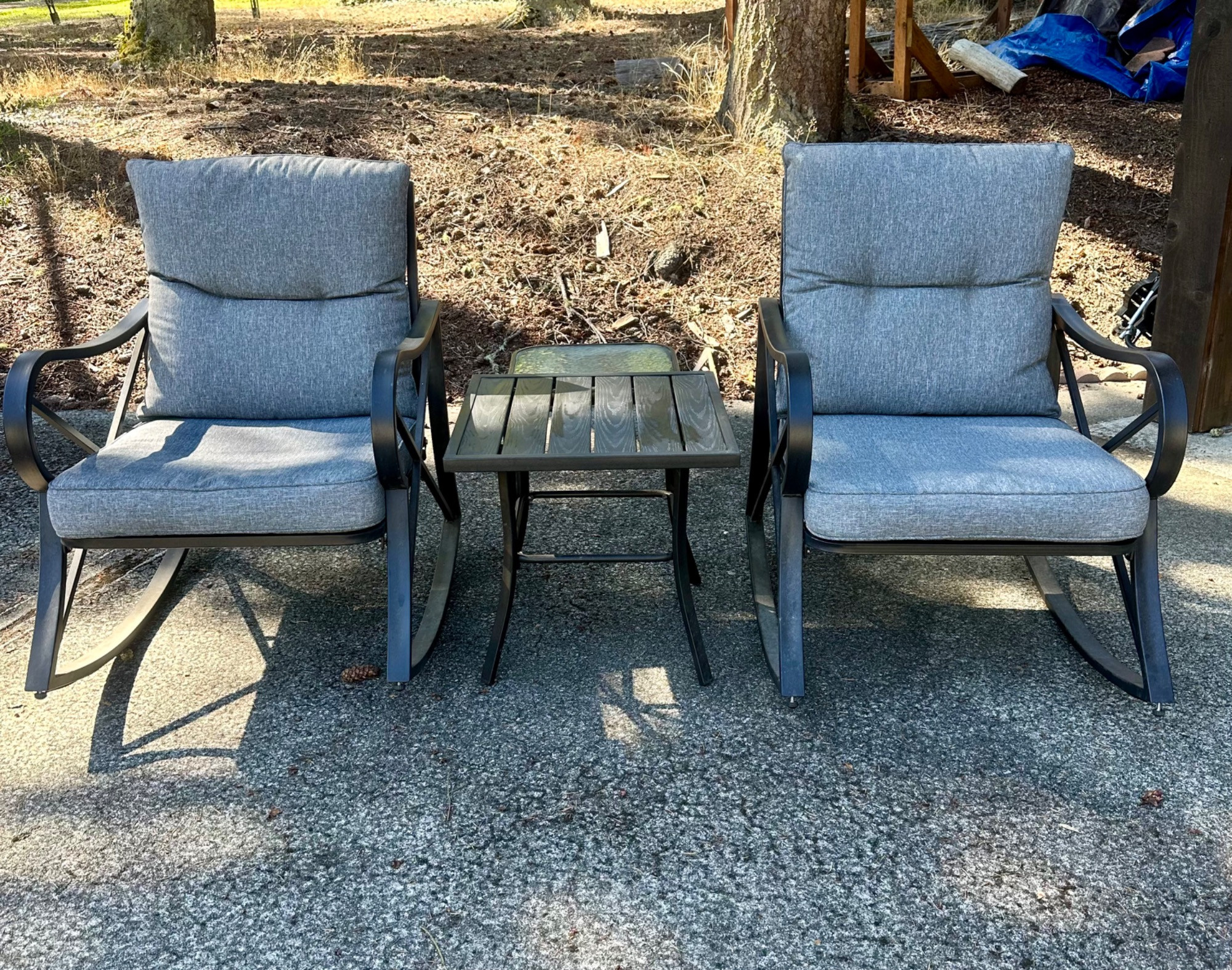 Cushioned Outdoor Patio Furniture Grey/Black No Tares/ No Breaks in Structure Table with glass shows weather wear. Rocker Chairs 25” x 29” 1/2 x 34” x 19”