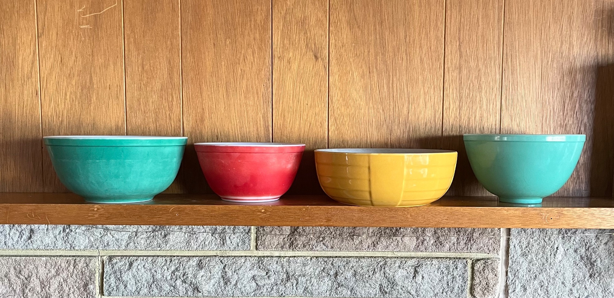 Bowls - Some Pyrex Yellow ceramic bowl (The Hall China Co for Hotpoint Tefrigerators) - Dia: 9” x 3 1/4” Green bowl - 7 3/8” x 4 3/8”
