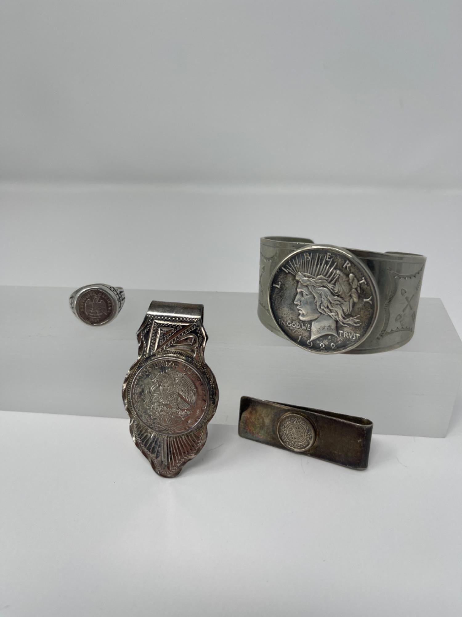 Sterling Cuff Bracelet, Two Sterling Money Clips, Sterling Coin Ring. Size 11 ring 136 Grams