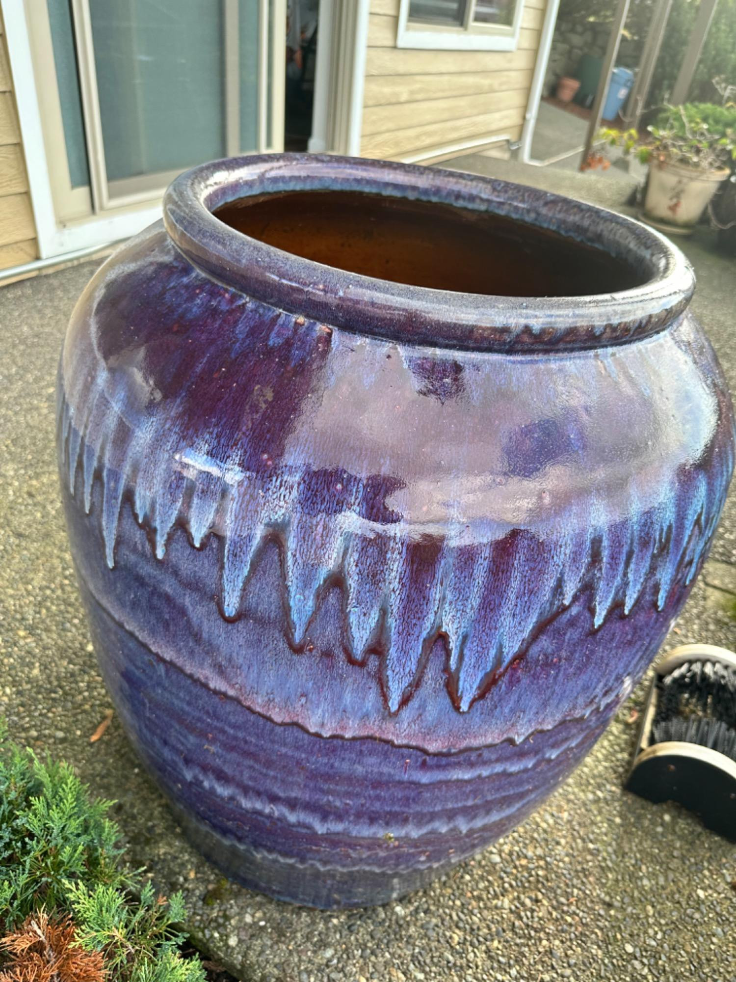 Very Large and Heavy Purple Drip Glaze Planter- 29 T x 21 W. Great for indoor or outdoor use. Great Condtion. Please note: this planter needs at least two people to move. Please bring a dolly.