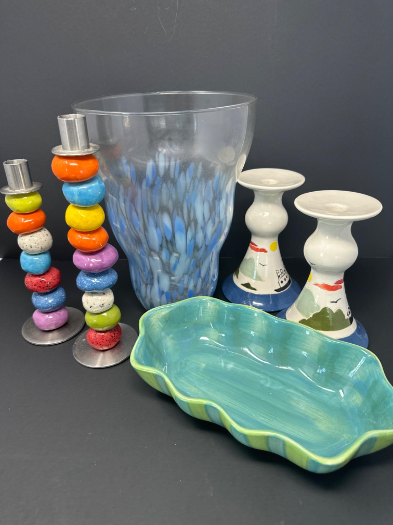 Spain Vase, Bilico? Candlesticks and Other Signed Items Hand blown blue glass Vase, marked Spain- 11 x 8 Light house Candle Sticks-signed- 7”tall Gail Bittman Bowl lime green ceramic bowl/tray- 11 x 6 x 2 Colorful gum ball looking candlesticks, Possibly Bilico???? Could not find markings (Please note in pictures, one of the structures has crack, there is crazing.)