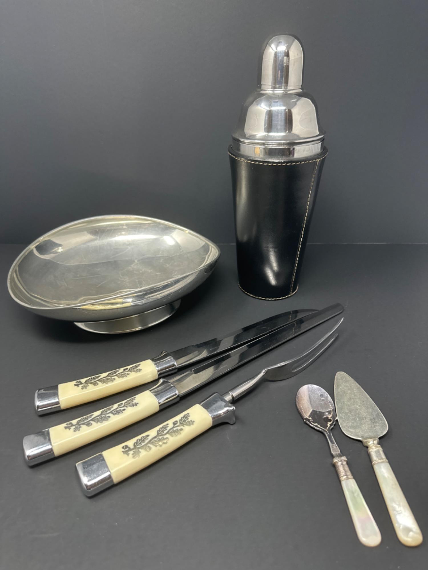 Lot # 29 - Cutlery, Colonial Pewter Bowl and Leather Shaker