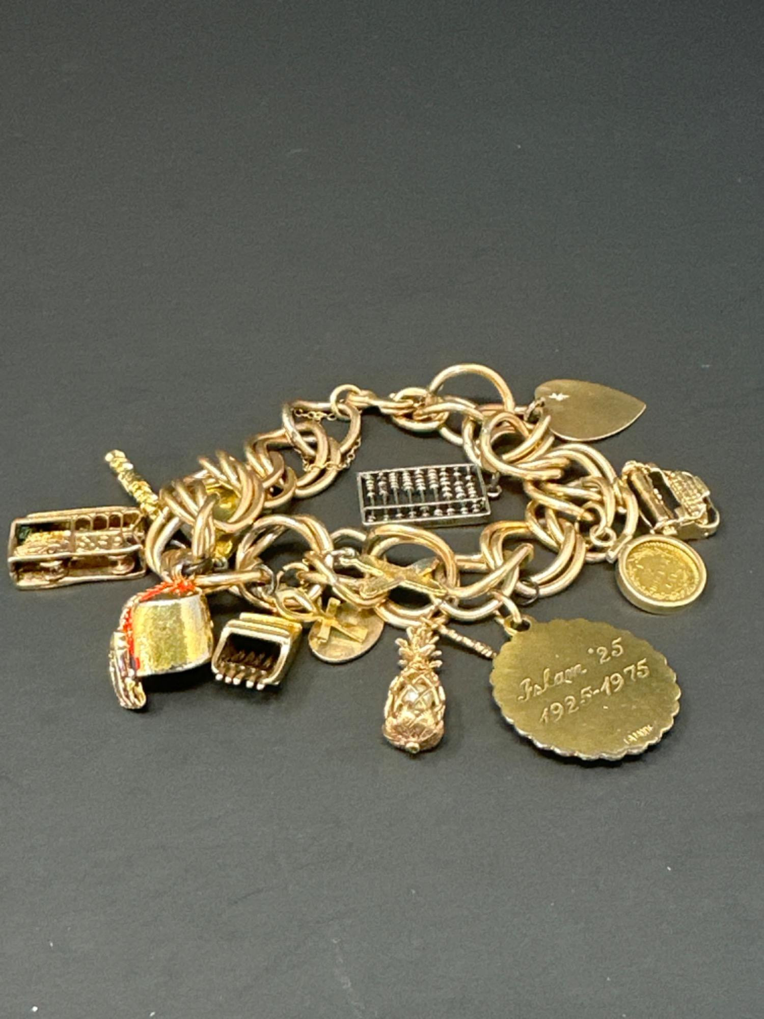 68 Grams (this weight included the other charms that are real gold) These four charms are 14K gold Heart- 14K Typewriter 14K Trolley- 14K Pineapple-14K