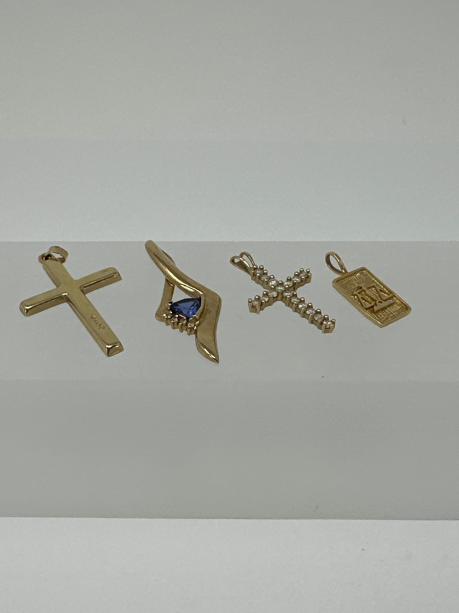 Two 10K and Two 14K Pendants. Diamond cross and gemstone pendant are 10K (4 grams total) Solid cross and other pendant are 14K (2 grams total)