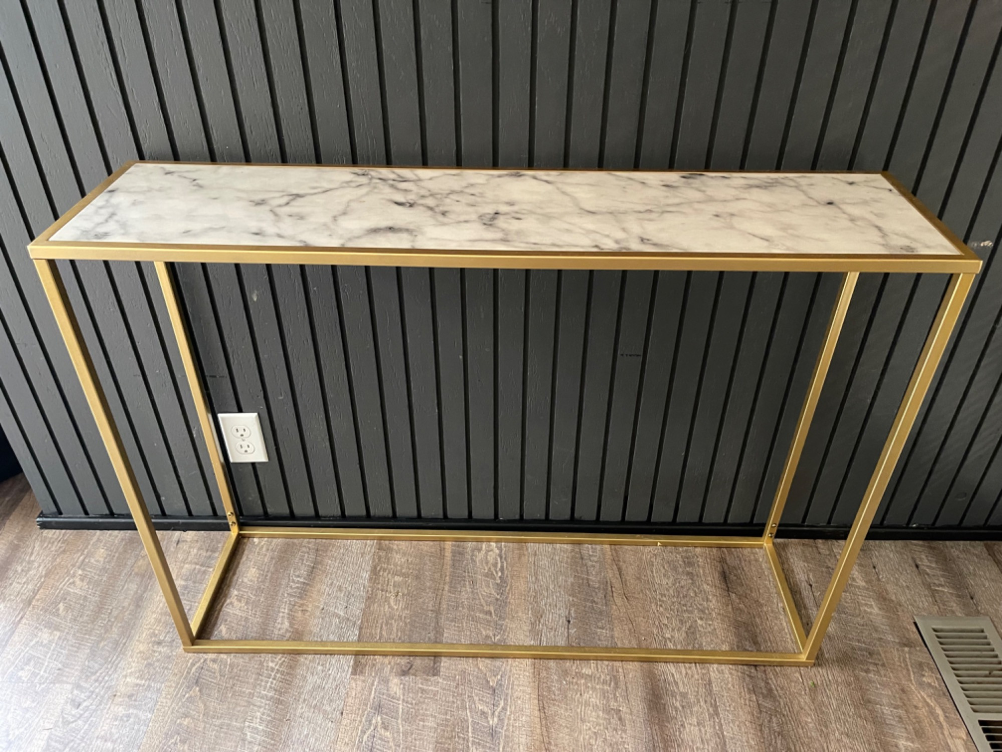 Marble Style Topped Gold Side Table Table is in good used condition with only very minor scratches and scuffs. Please see photos.