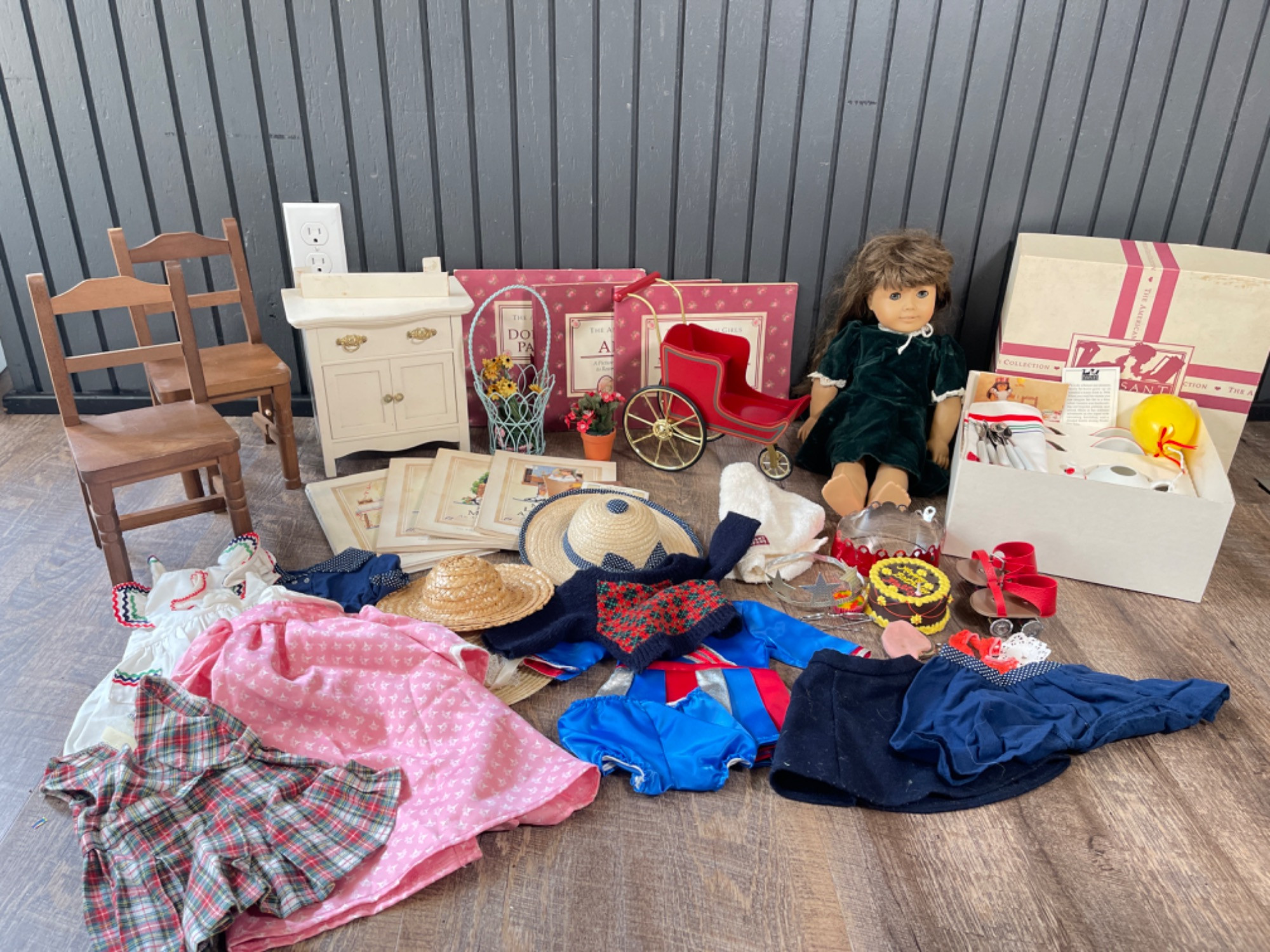 Pleasant Co American Girl Doll Items All pieces are used and have damage or missing pieces to them. Both chairs and dresser have some broken pieces and need repair. Please see photos. Doll has marker marks on her face and all pieces need cleaning. Doll's hair also needs some love. The little sleigh buggy is in the best condition out of everything and has very minimal to no damage. Largest item: 18.5” H