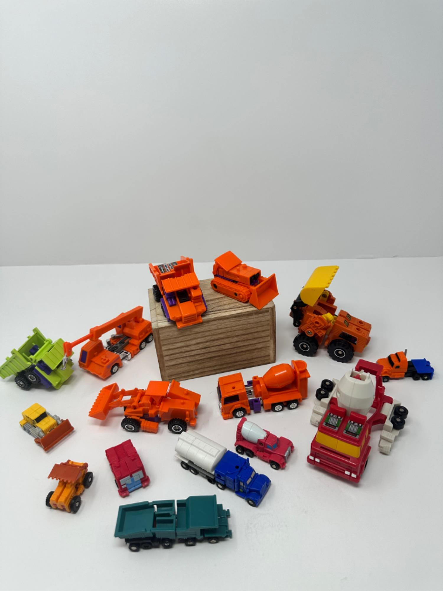 Vintage 1980s Transformers Construction Vehicles Display block NOT included. Good used condition, were used as toys. Completeness NOT guaranteed, but all appear to be complete.