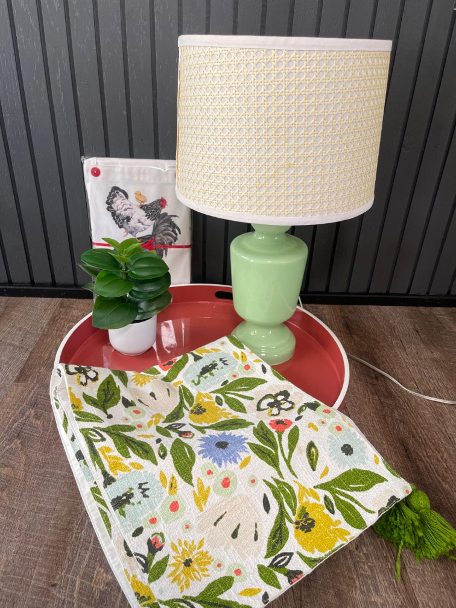 Lot # 147 - Large West Elm Red Tray, Beautiful Lamp, Tablerunner & Apron!