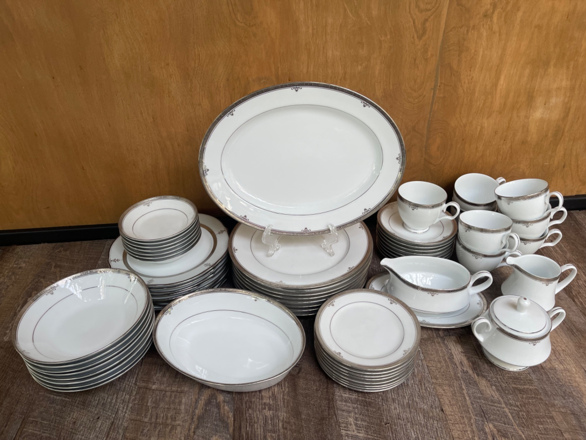 61-Piece Contemporary Noritake Buckingham Platinum China Great condition, little to no damages. Smallest: 3.5" W Largest: 13.5" W
