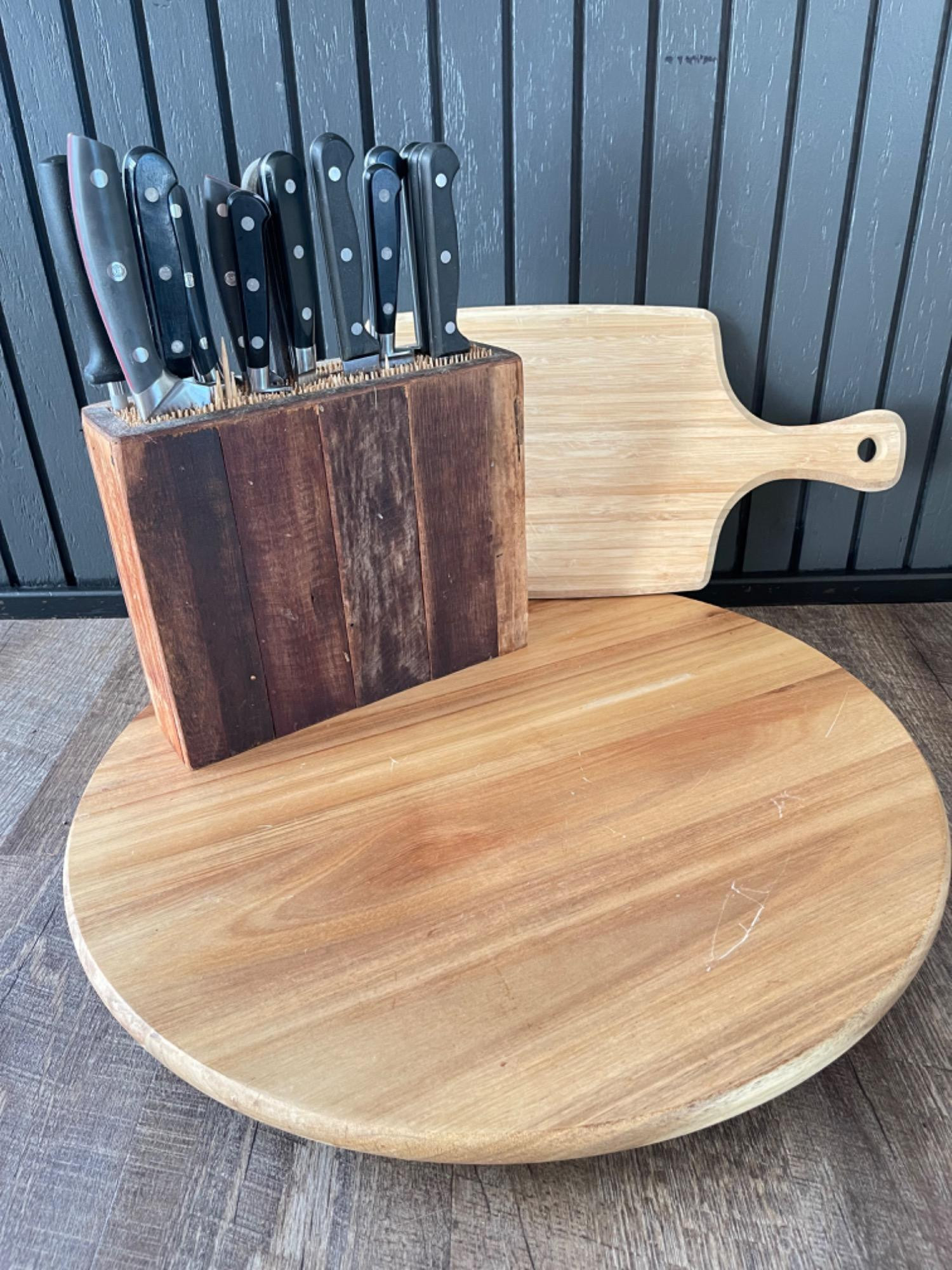 Wood Trays, Knife Holder & Knives! All are used. Cutting board/platters both have knife marks and scuffs from use. See photos. Large platter: 20.5" W Knife Holder: 10.5" W