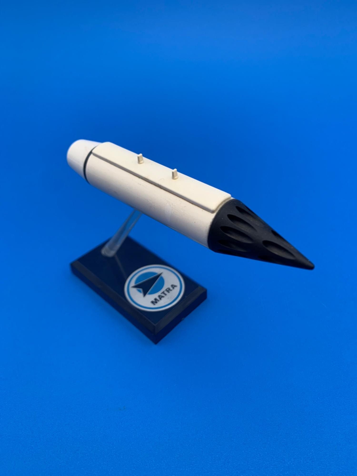 but this one is beyond our pay grade! Measures approx. 3.75 H x 5” L x 1.75” W. Note small scrape at rear of fuselage on last photo. UPDATE: Many thanks to one of our expert bidders who sent us the following information on this item: "The MATRA model was a French-made under-the-wing mounted rocket launcher for fighter aircraft."
