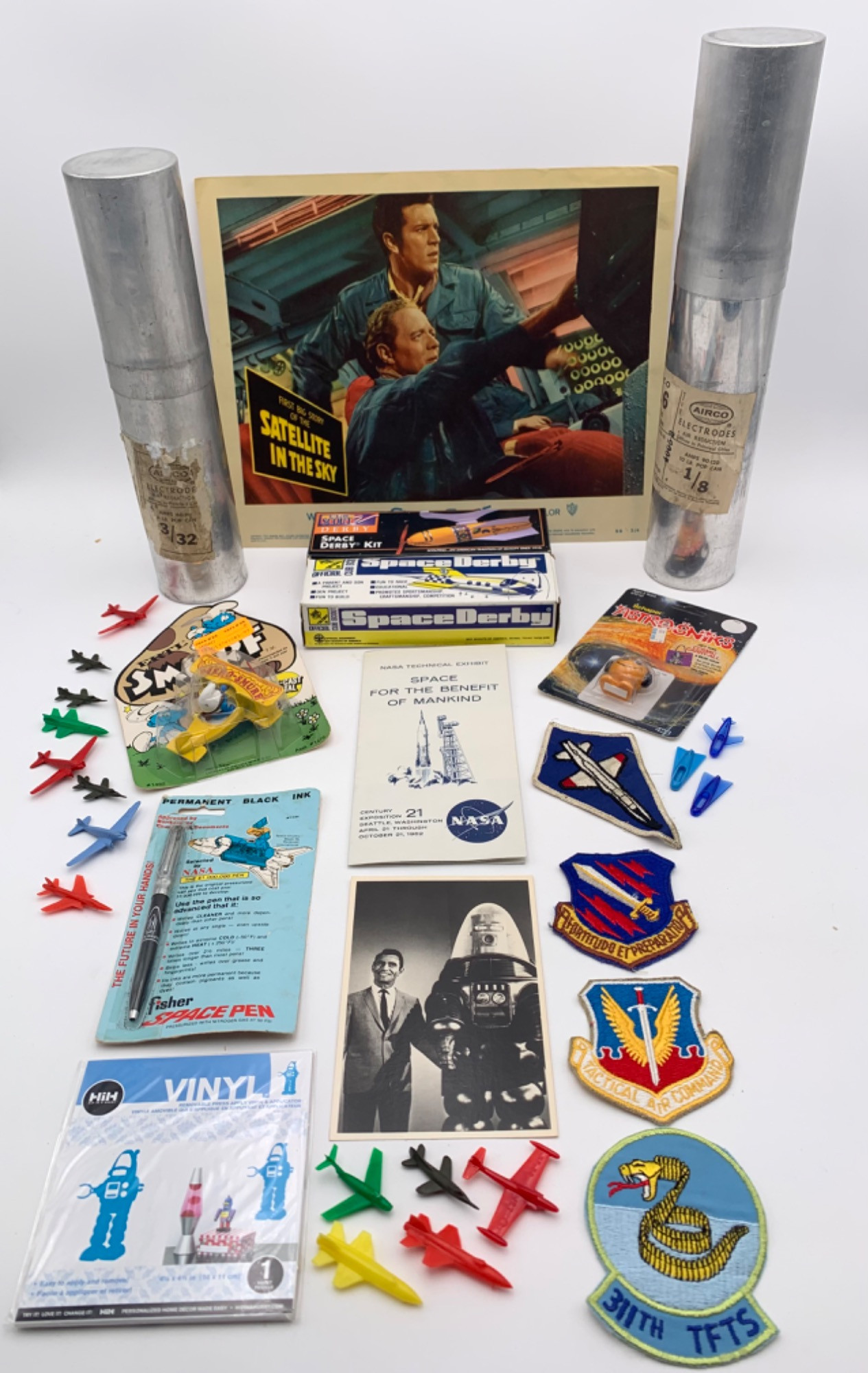 Robot from Forbidden Planet – new & unused. 1 “Satellite in the Sky” theater lobby card – 11” H x 14” W 1 NASA brochure from the 1962 World's Fair in Seattle. 1 vinyl Robby the Robot sticker. 4 USAF military patches - authentic, used & unused. 1 Fisher Space Pen (pressurized to work in extreme temperatures) - vintage in original packaging