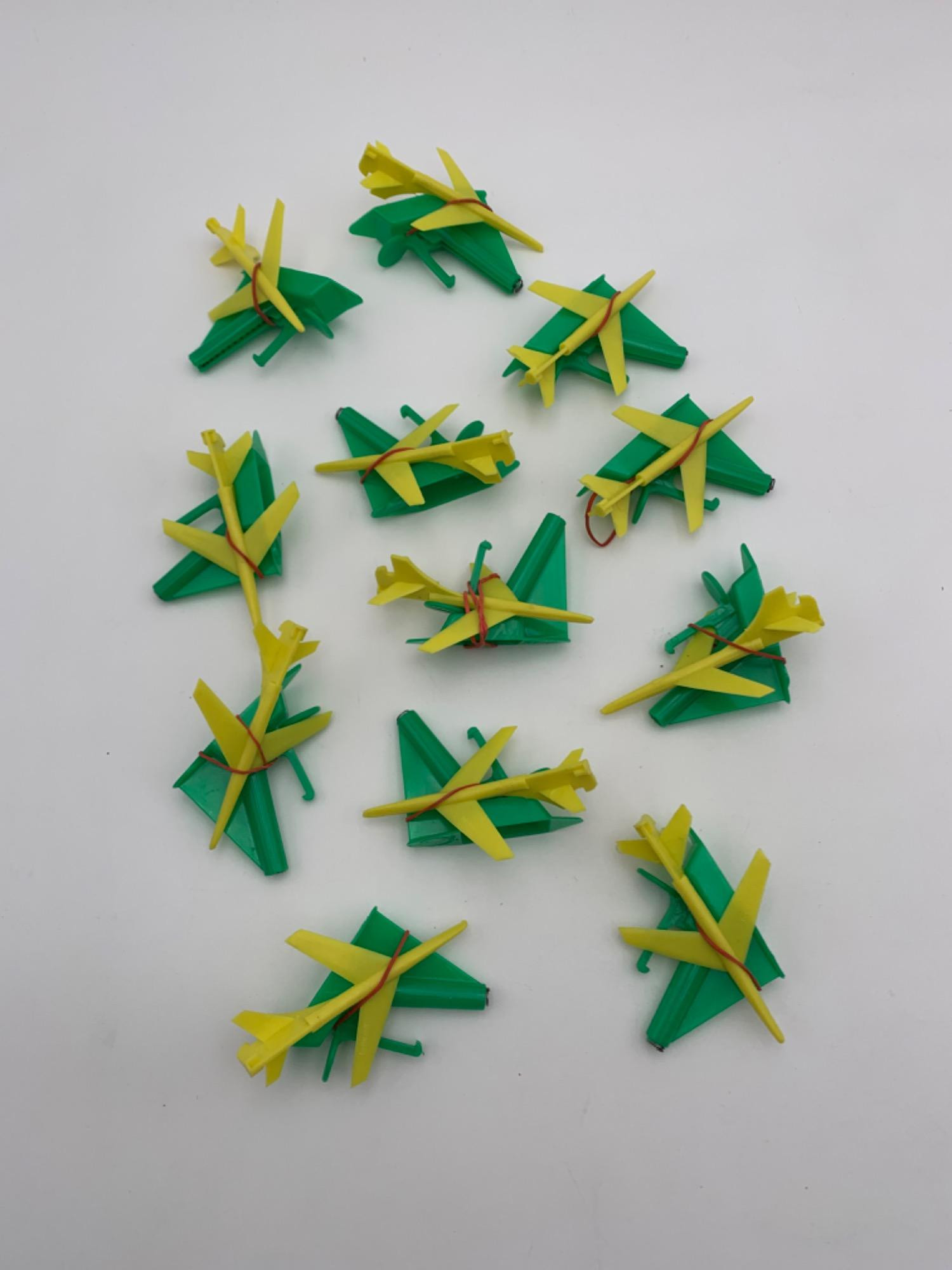 (12) of Aircraft & launchers. Aircraft are are yellow with a green launching base. Made in West Germany for Albert & Sons of New York. Each launcher has a spring in it