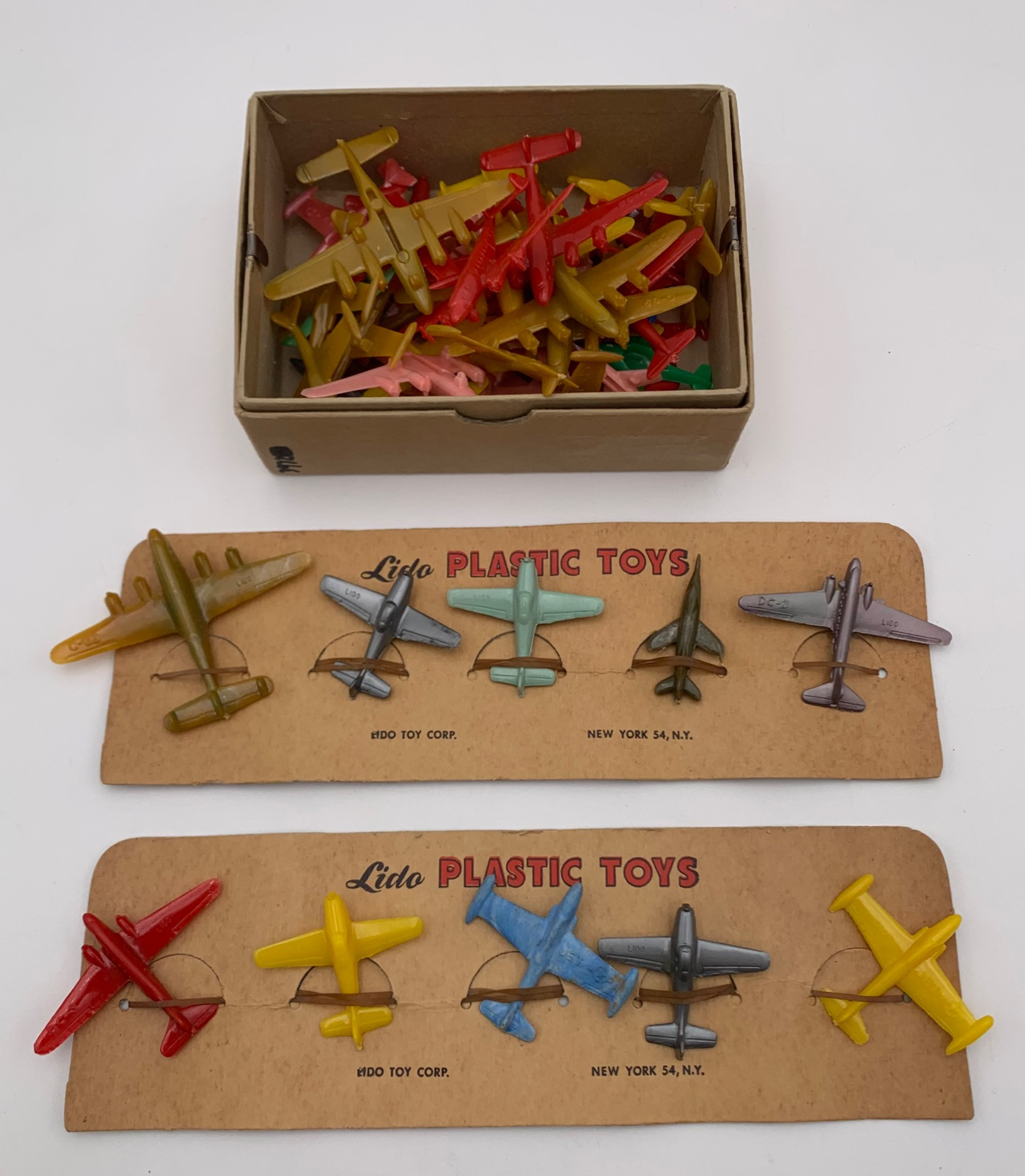 are from the 1950s and are in excellent condition. Also included are 2 original backer boards for retail sales & a mailing box for the loose ones. Here's a smaller lot for sale: https://www.etsy.com/listing/1758030877/6-1-vintage-miniature-toy-airplanes-lido